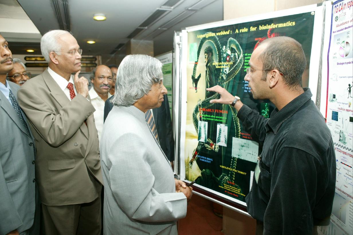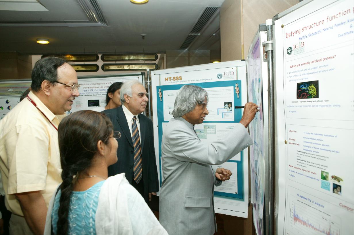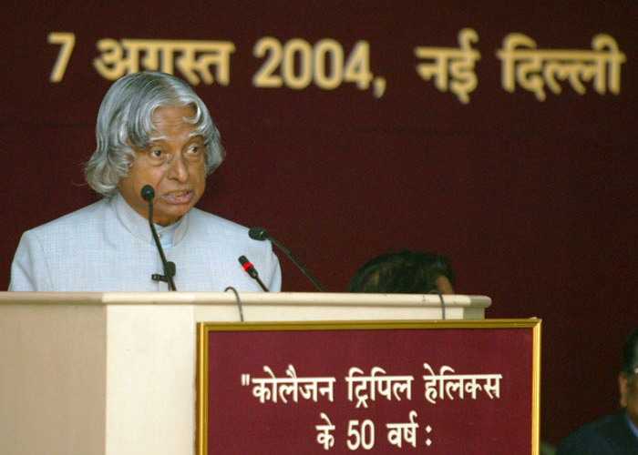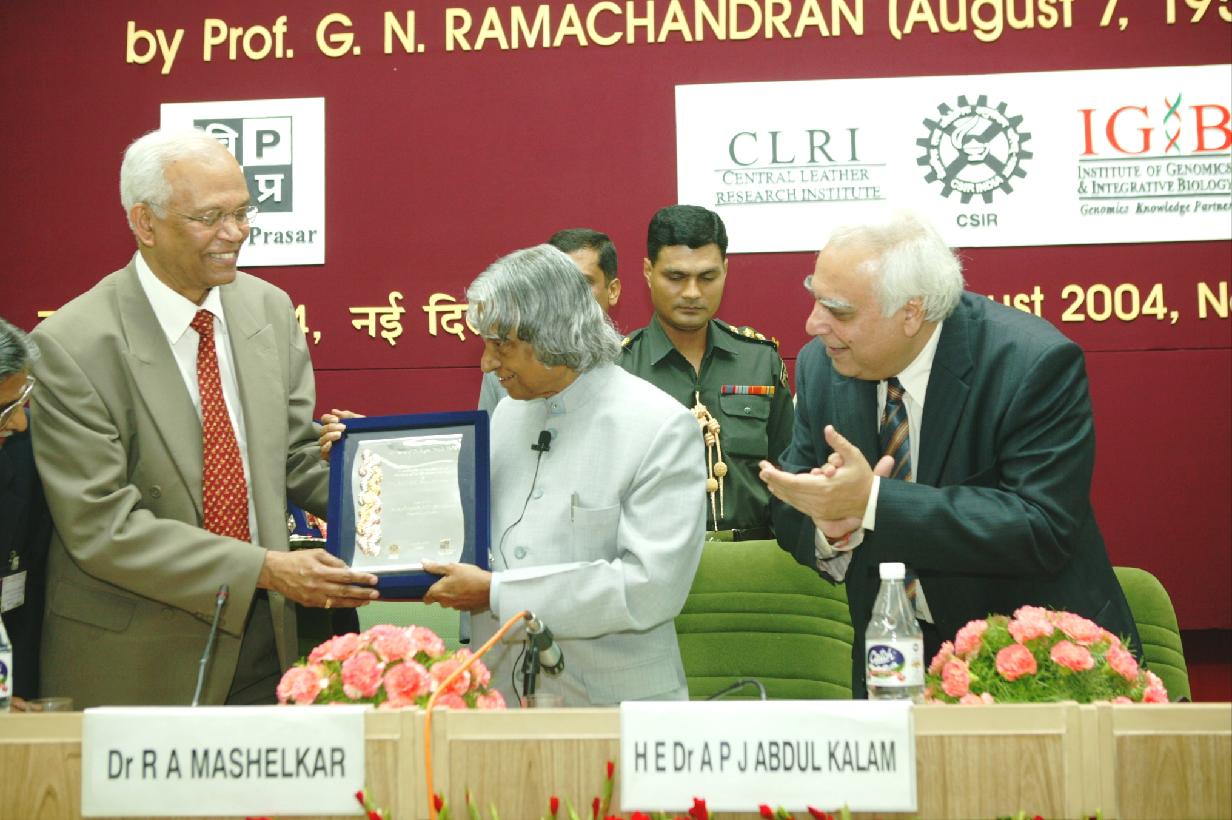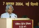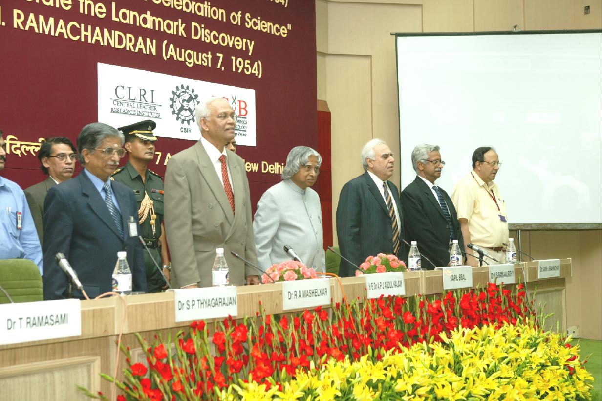 | Caption: | The President of India, Dr A P J Abdul Kalam participating in the Celebration of 50 Years of the Discovery of the Triple Helical Structure of Collagen by Prof G N Ramachandran at Vigyan Bhavan in New Delhi on Aug 07, 2004 |