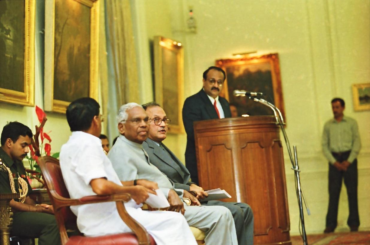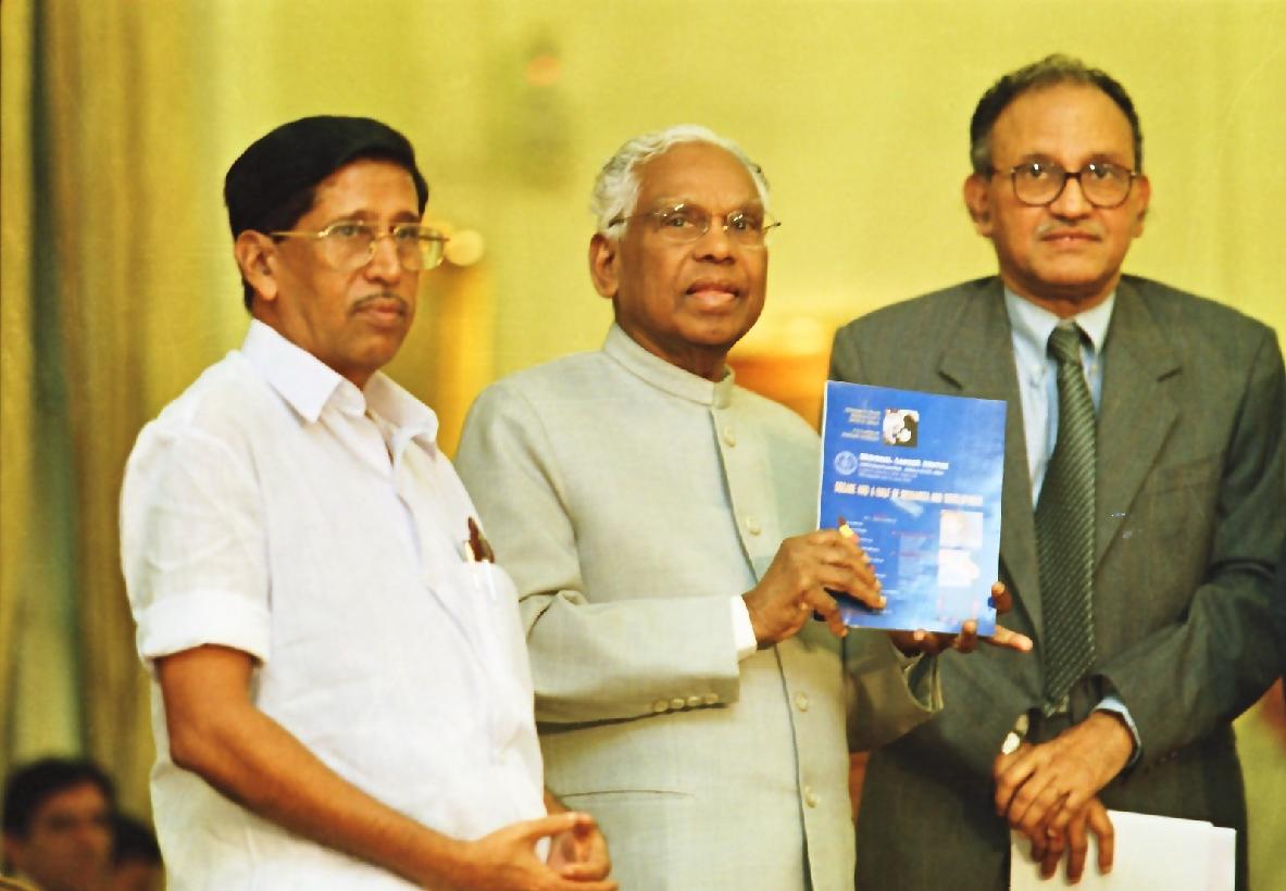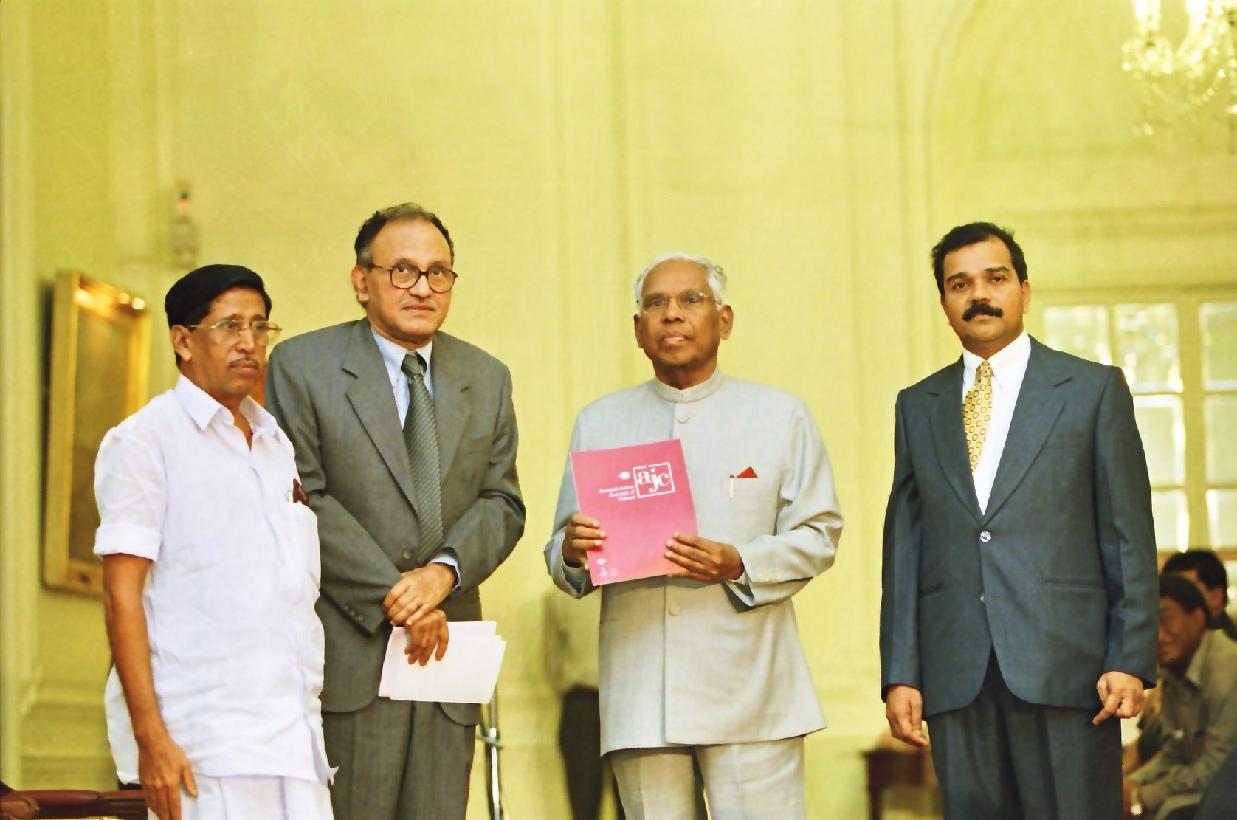 | Caption: | The President of India, Shri K R Narayanan receiving the First Copies of the 'The Austral Asian Journal of Cancer from Dr Thomas Koilparampil and 'The RCC Research One and a Half Decades from Dr Radhakrishna Pillai at the Yellow Drawing Room of Rashtrapati Bhavan in New Delhi on June 07, 2000 |