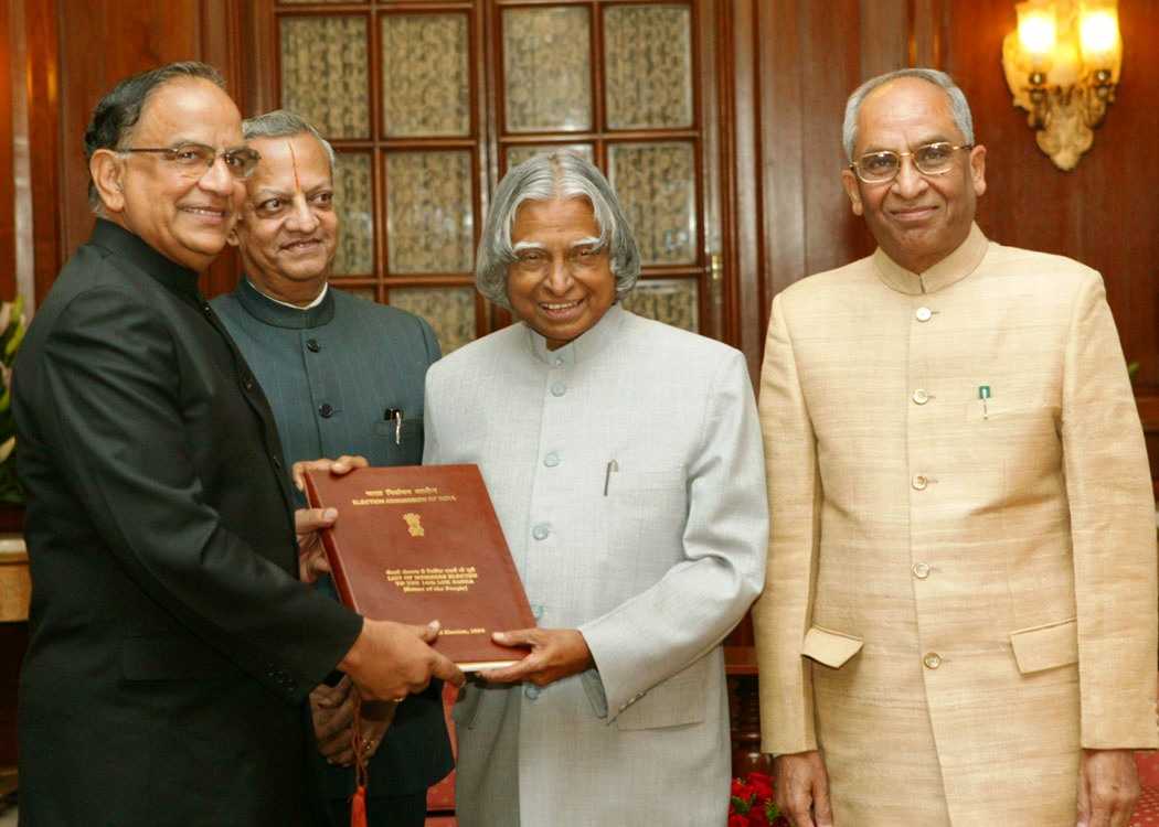 | Caption: | The President of India, Dr A P J Abdul Kalam meeting with the Chief Election Commissioner, Shri T S Krishnamurthy, Election Commissioner, Shri N Gopalaswami, Election Commissioner, Shri B B Tandon, Deputy Election Commissioner, Shri A N Jha at the Rashtrapati Bhavan in New Delhi on May 17, 2004 |