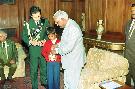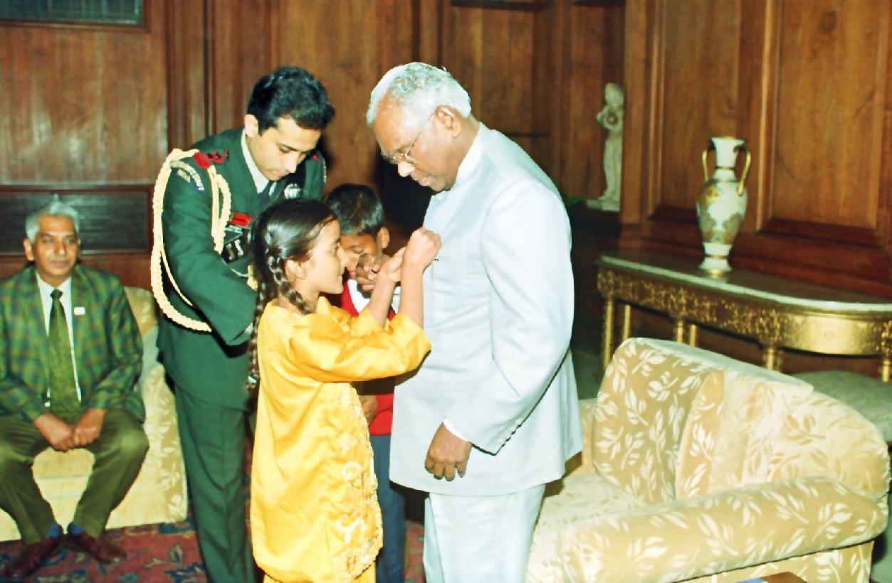 | Caption: | The President of India, Shri K R Narayanan with the Members of National Foundation for Communal Harmony and Children to pinning a flag at the Committee Room of Rashtrapati Bhavan in New Delhi on Nov 25, 1997 |