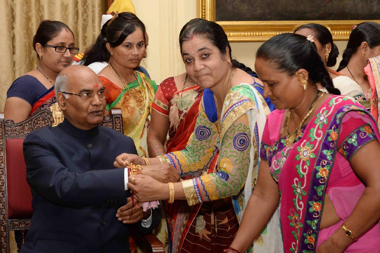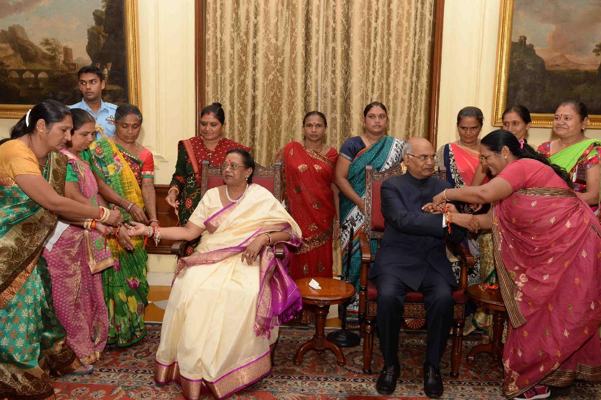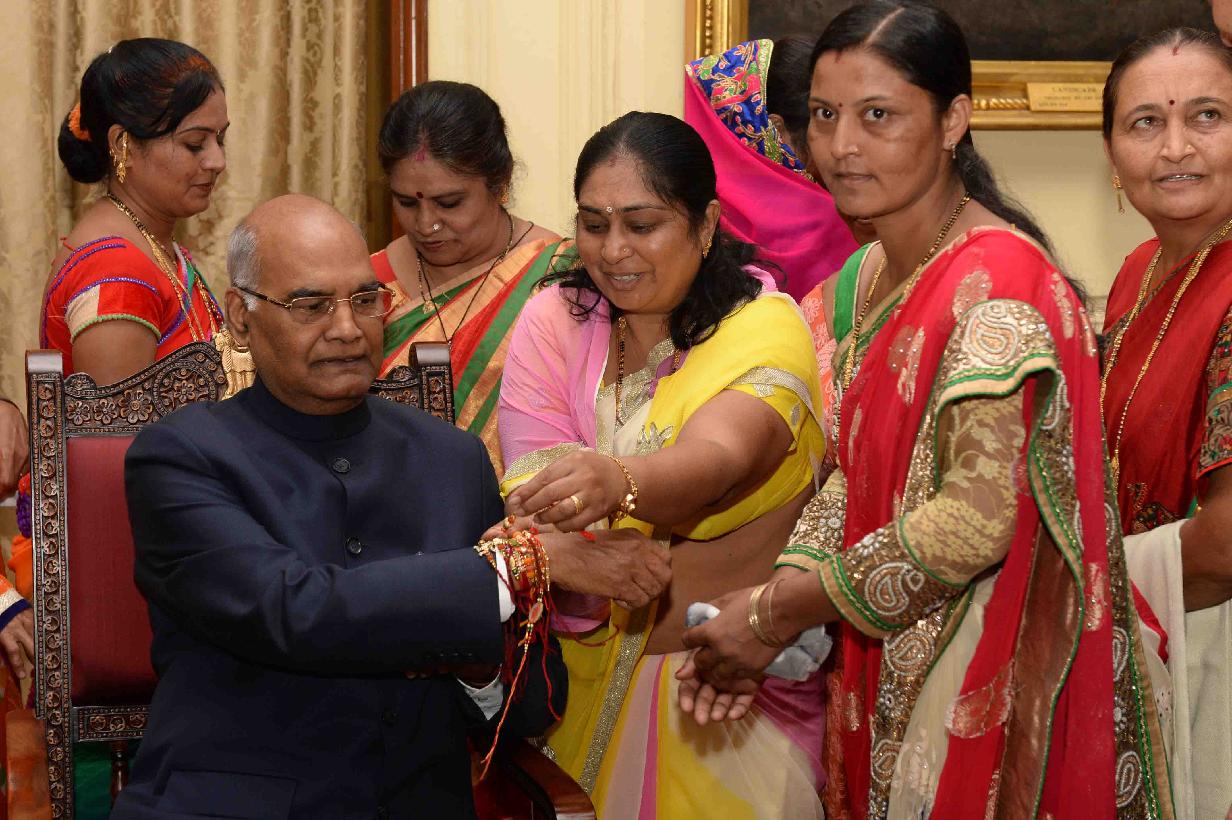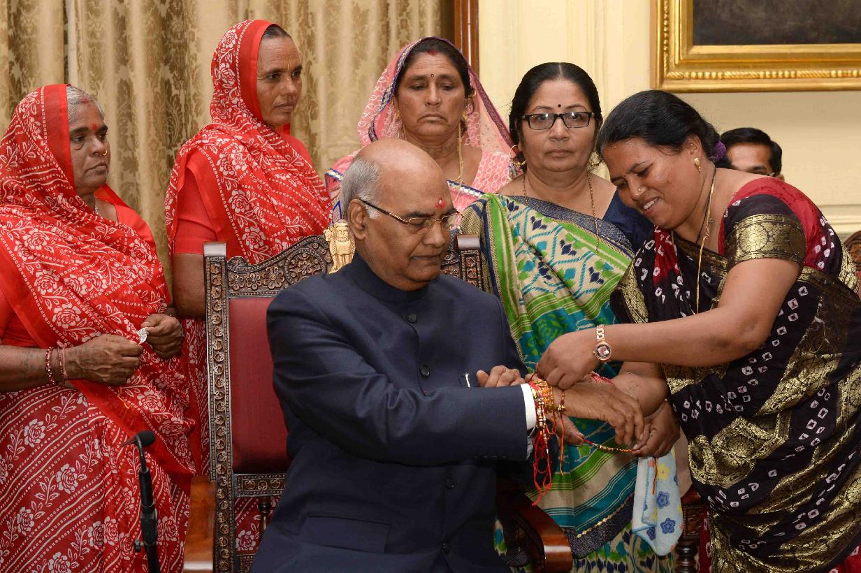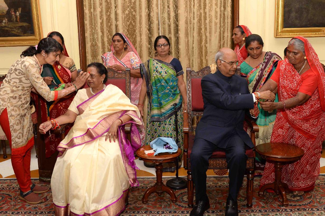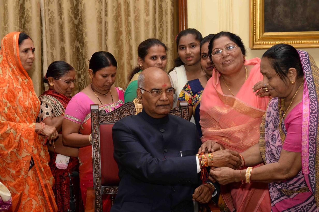 | Caption: | The President of India, Shri Ram Nath Kovind and Smt. Savita Kovind, First Lady of India receiving Raksha Bandhan greetings from ladies belonging Gujarat Koli Samaj alongwith office bearers of Shree Laxminarayan Education & Charitable Trust, Junagadh, at Rashtrapati Bhavan on August 07, 2017. |