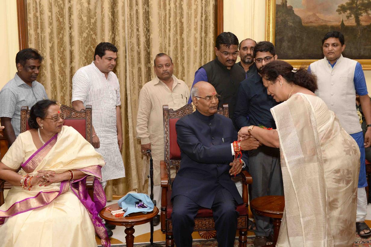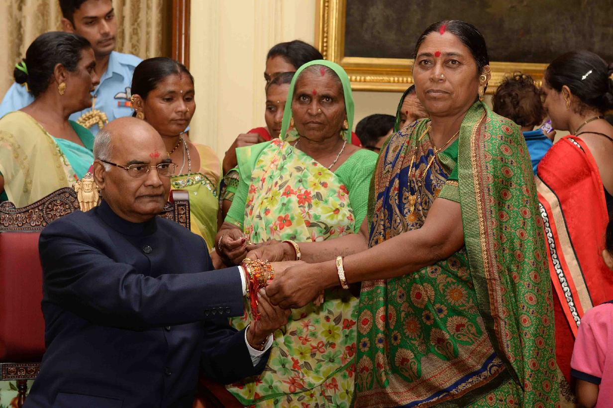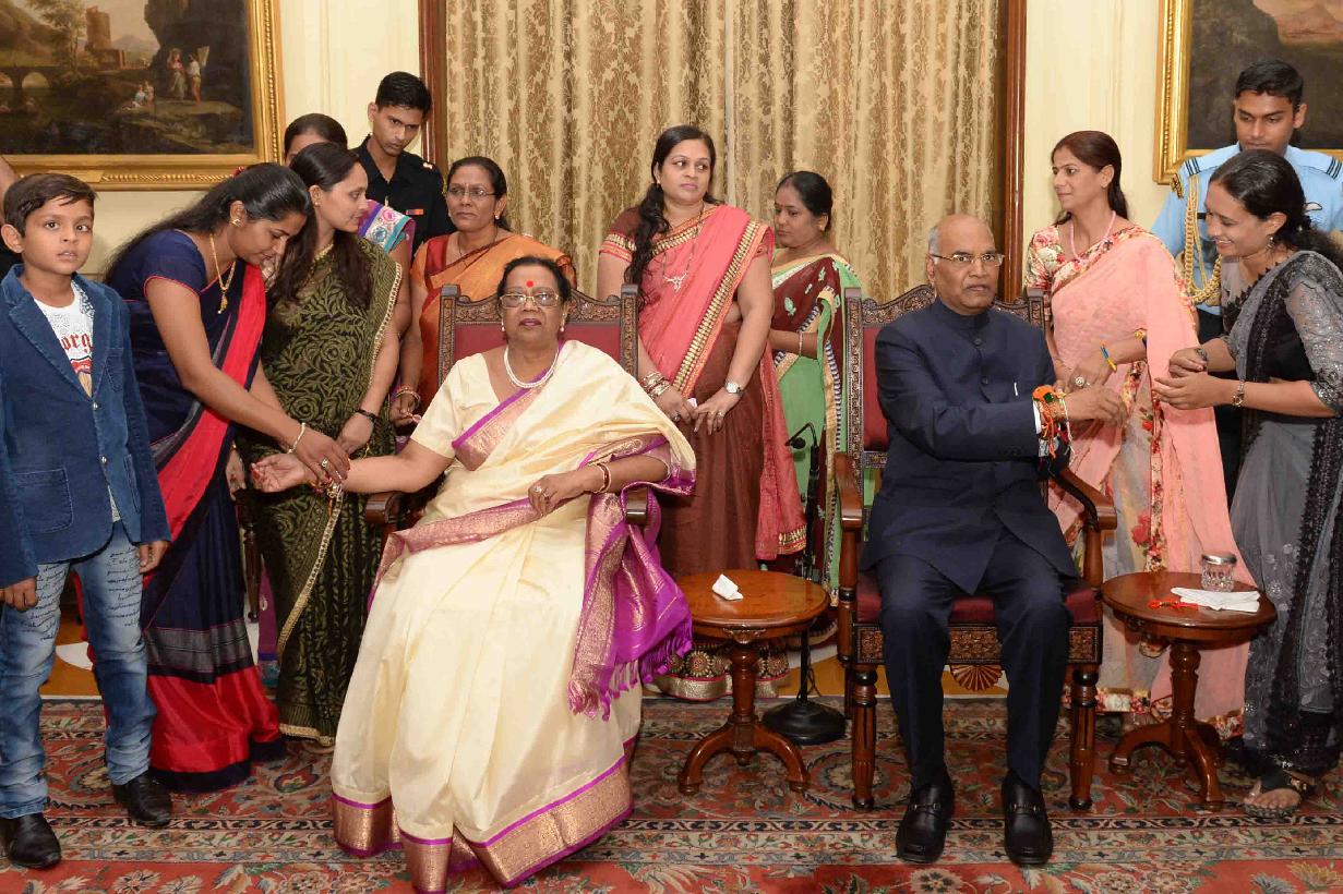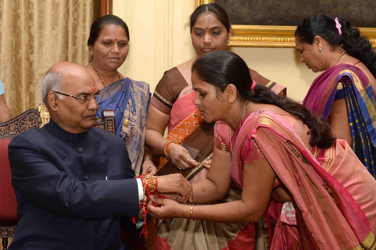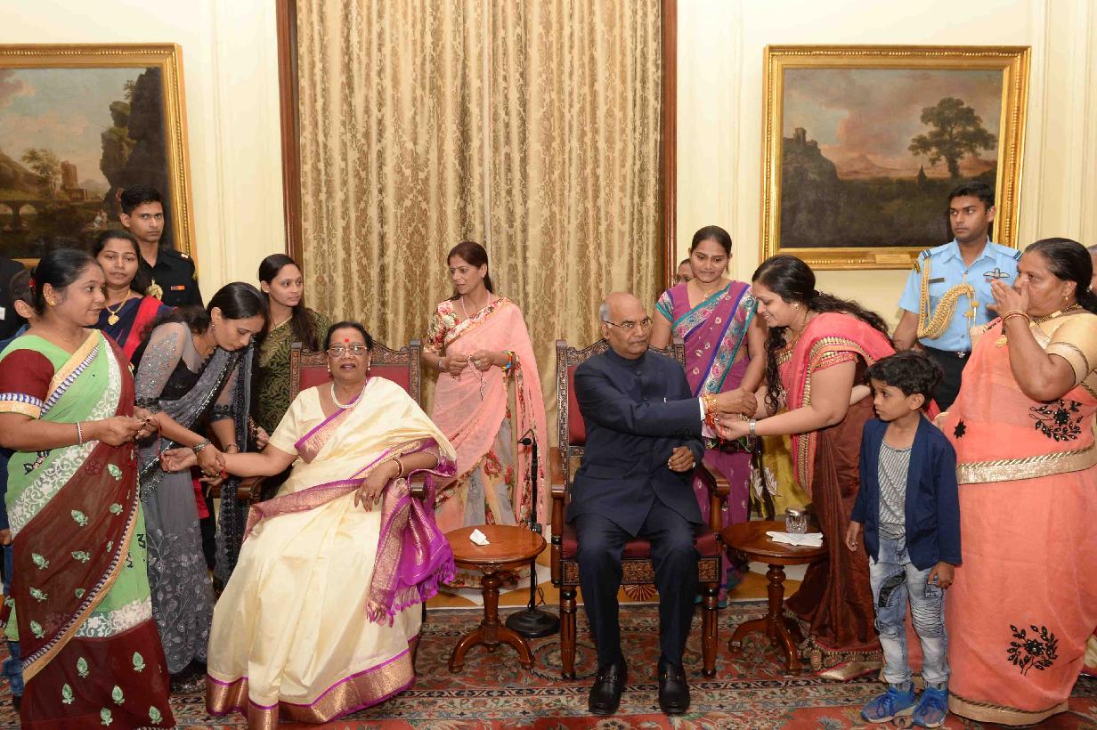 | Caption: | The President of India, Shri Ram Nath Kovind and Smt. Savita Kovind, First Lady of India receiving Raksha Bandhan greetings from ladies belonging Gujarat Koli Samaj alongwith office bearers of Shree Laxminarayan Education & Charitable Trust, Junagadh, at Rashtrapati Bhavan on August 07, 2017. |