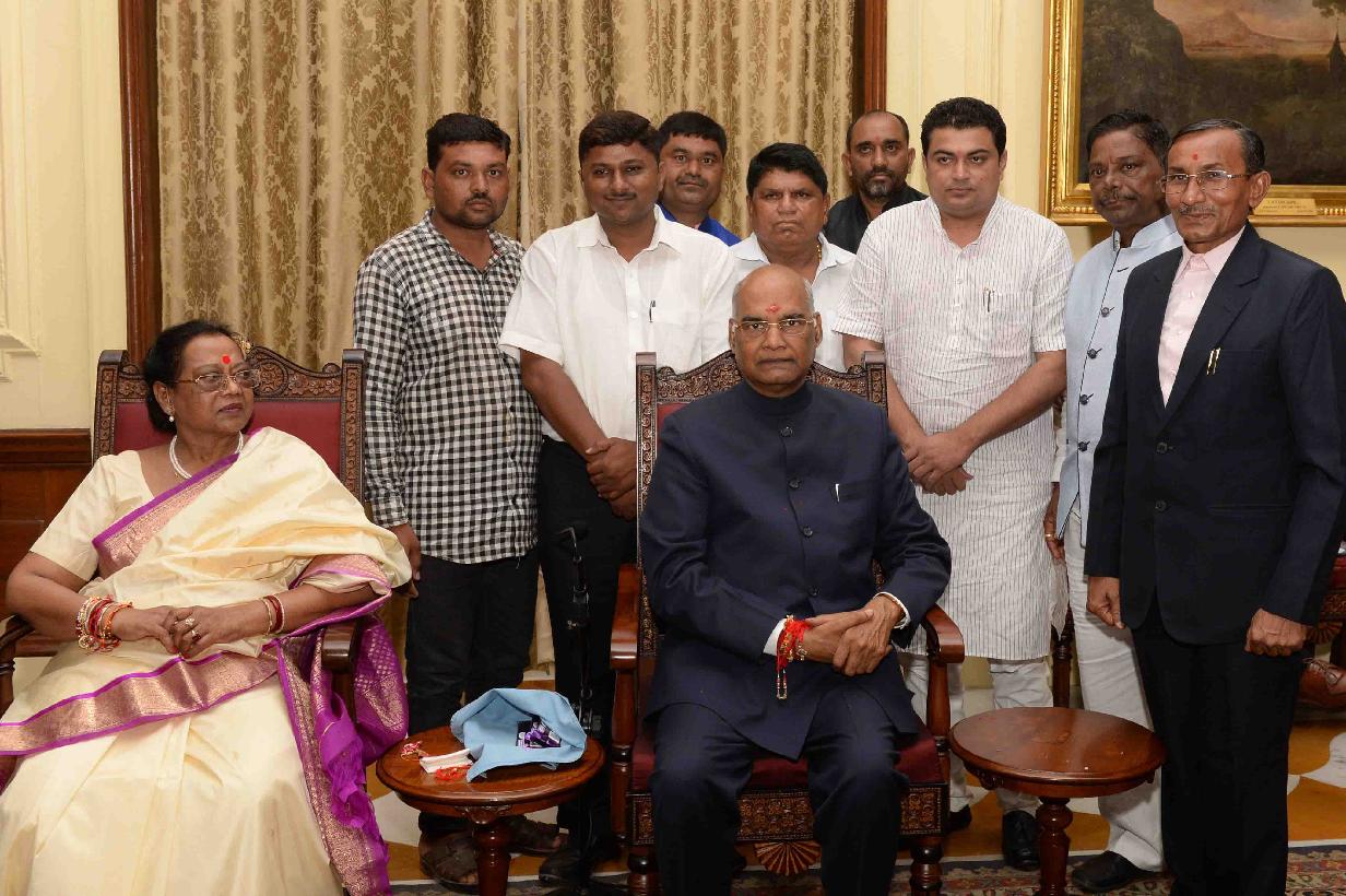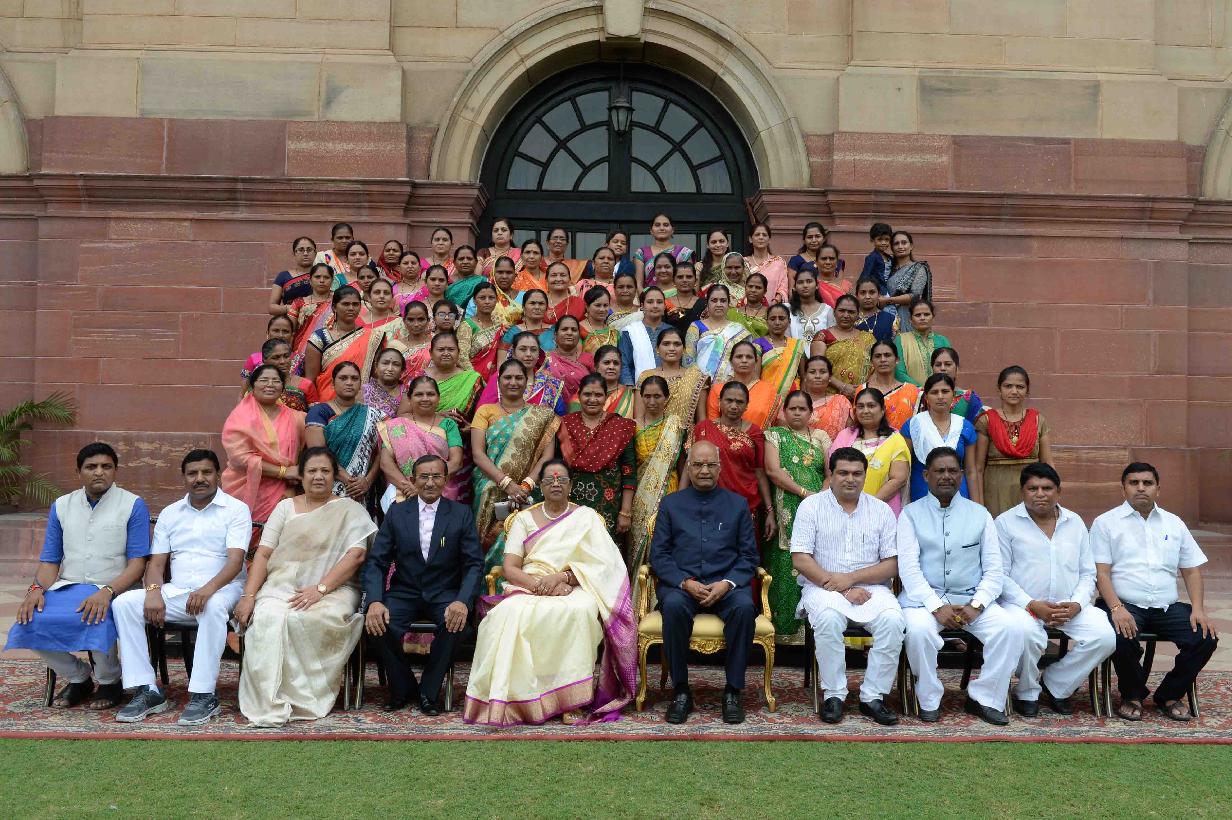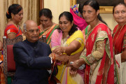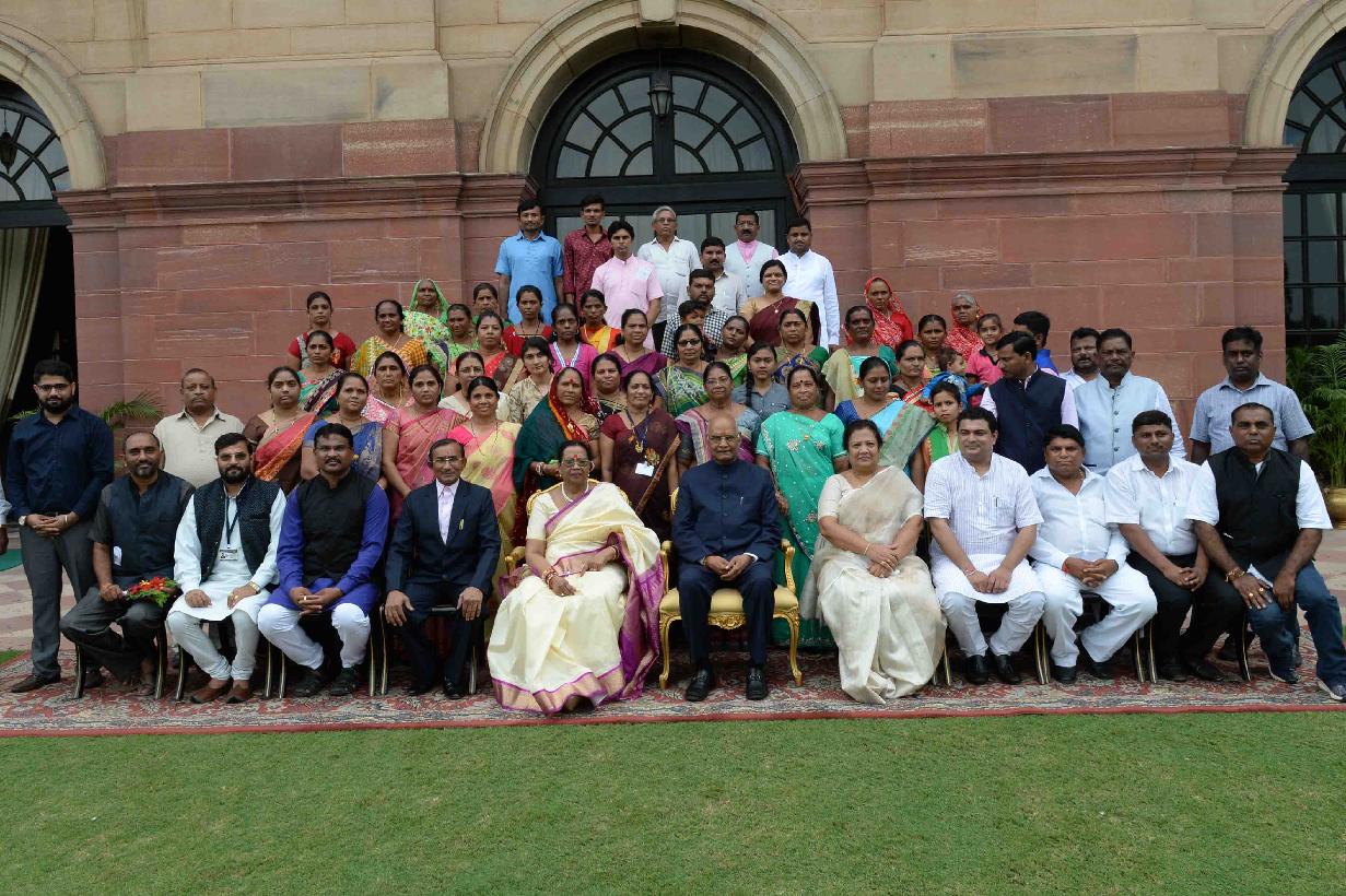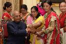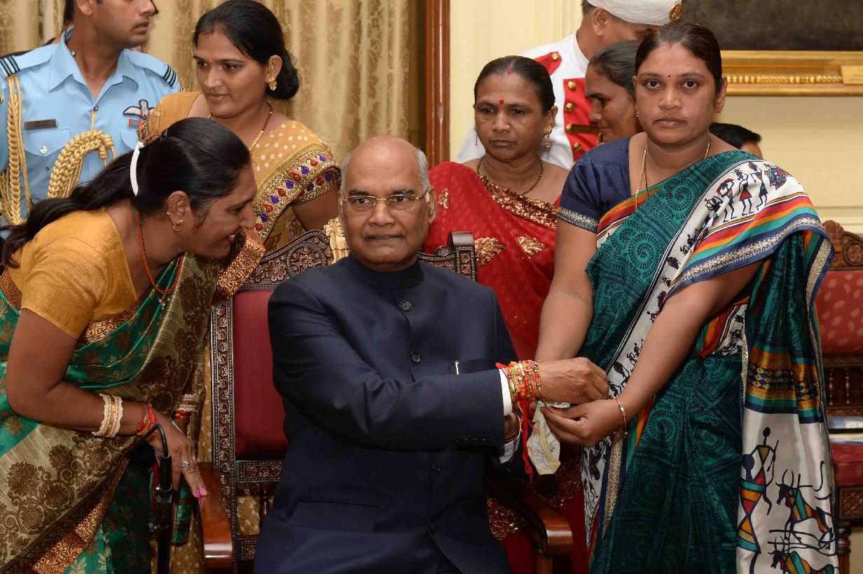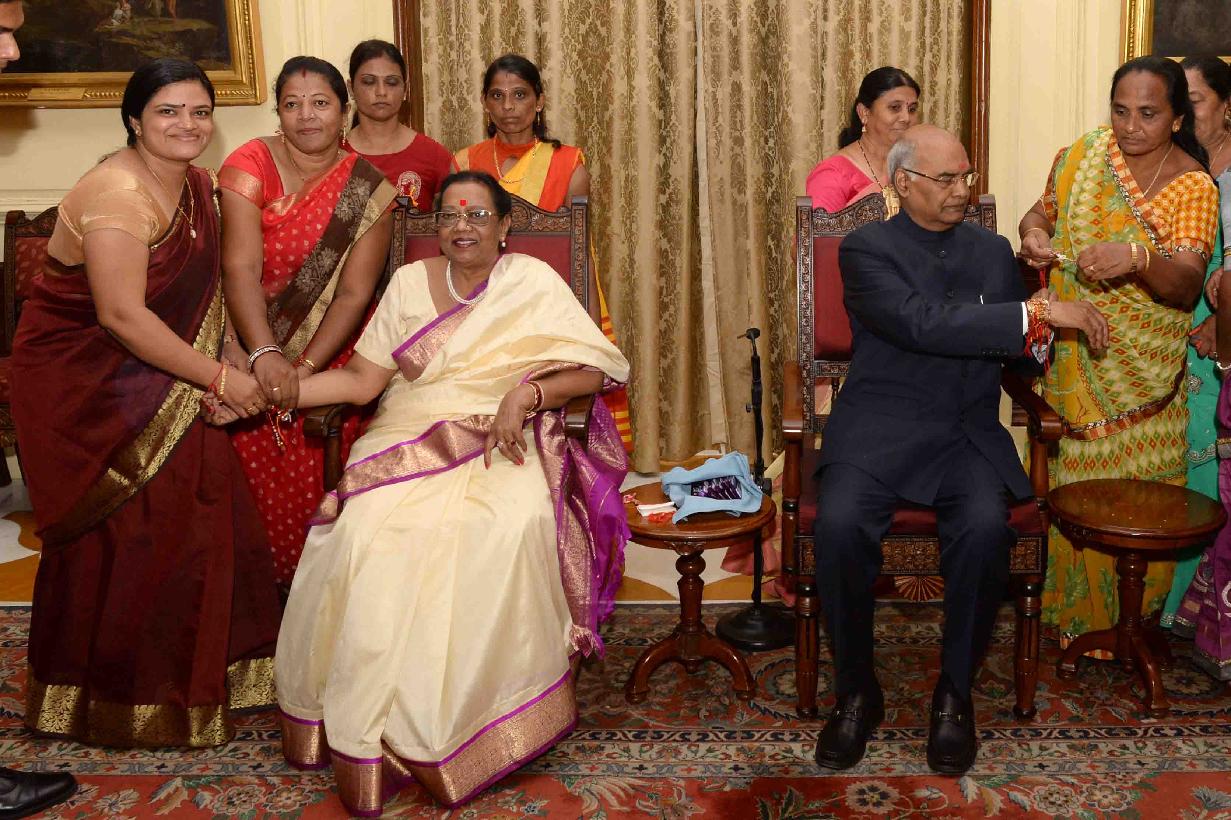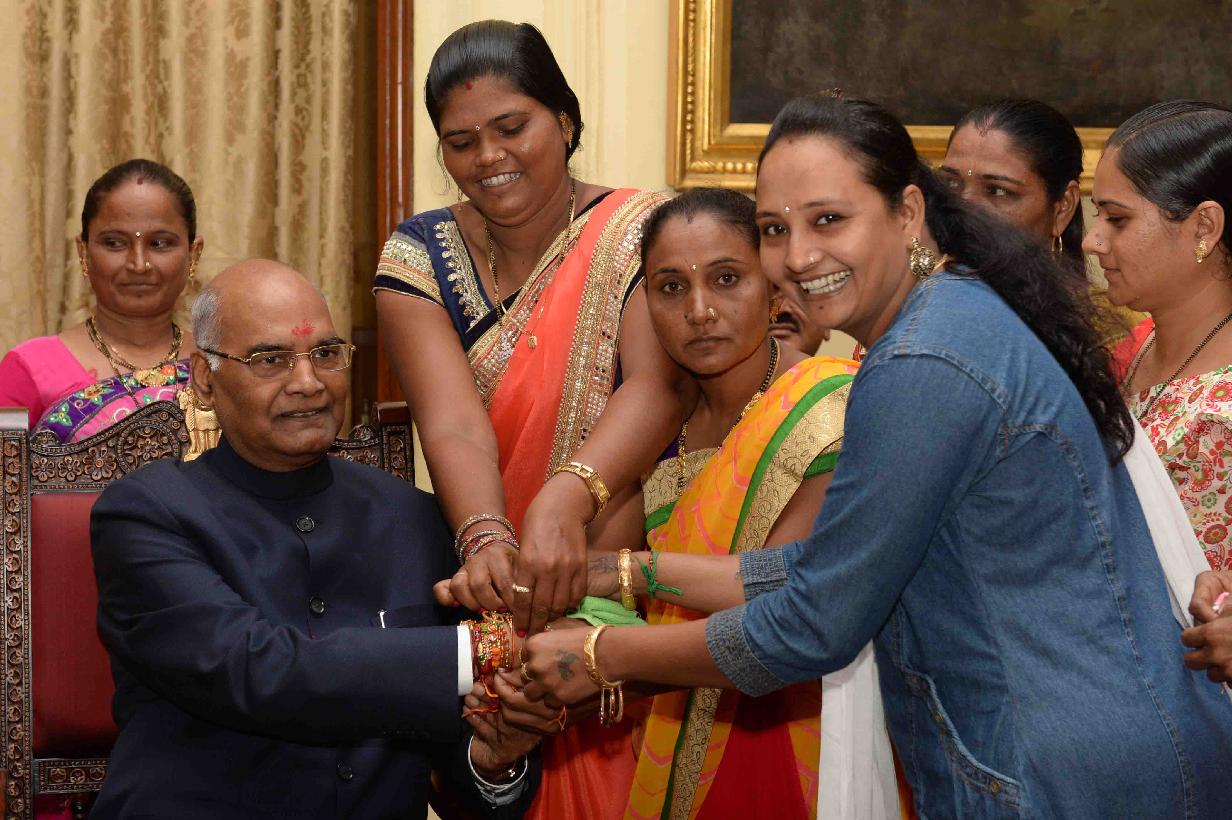 | Caption: | The President of India, Shri Ram Nath Kovind and Smt. Savita Kovind, First Lady of India receiving Raksha Bandhan greetings from ladies belonging Gujarat Koli Samaj alongwith office bearers of Shree Laxminarayan Education & Charitable Trust, Junagadh, at Rashtrapati Bhavan on August 07, 2017. |