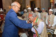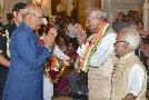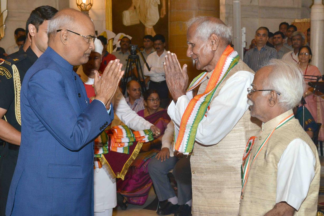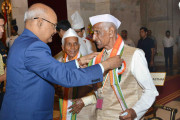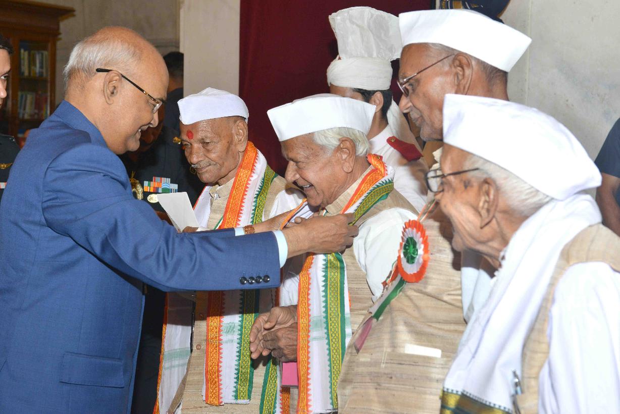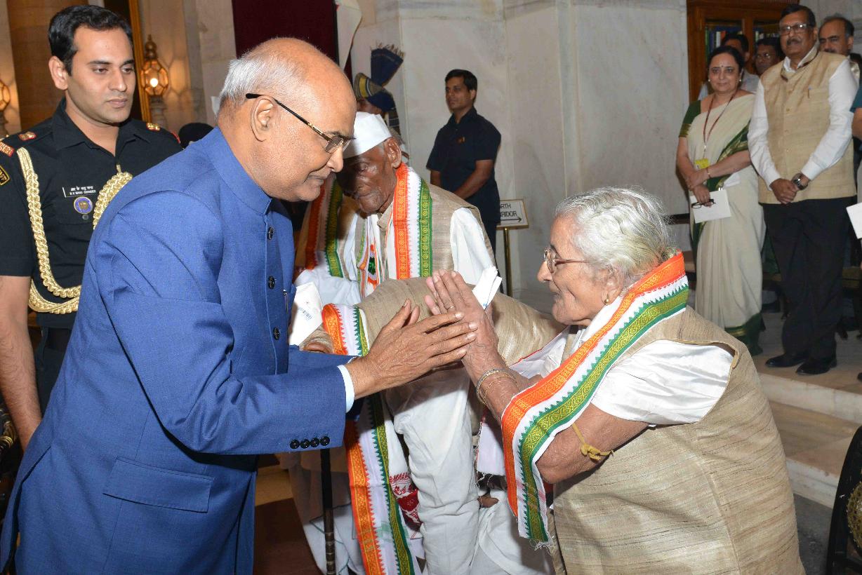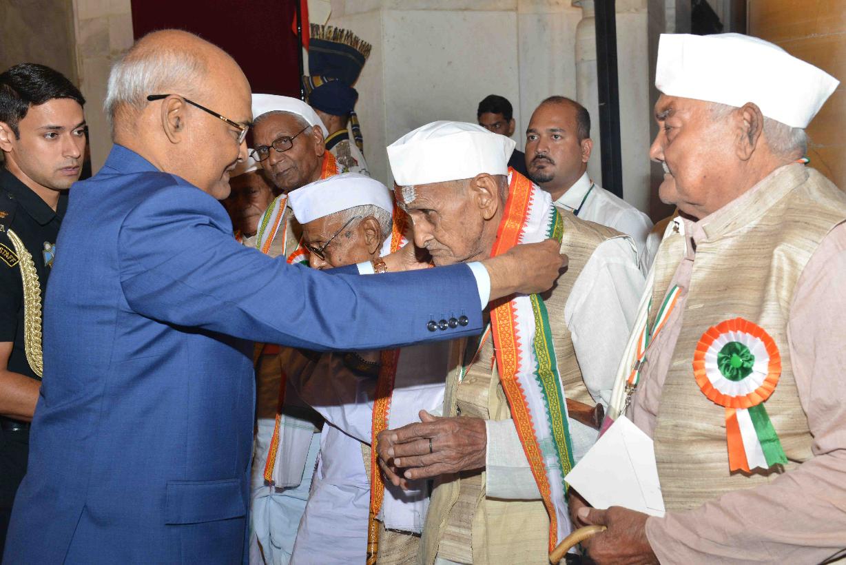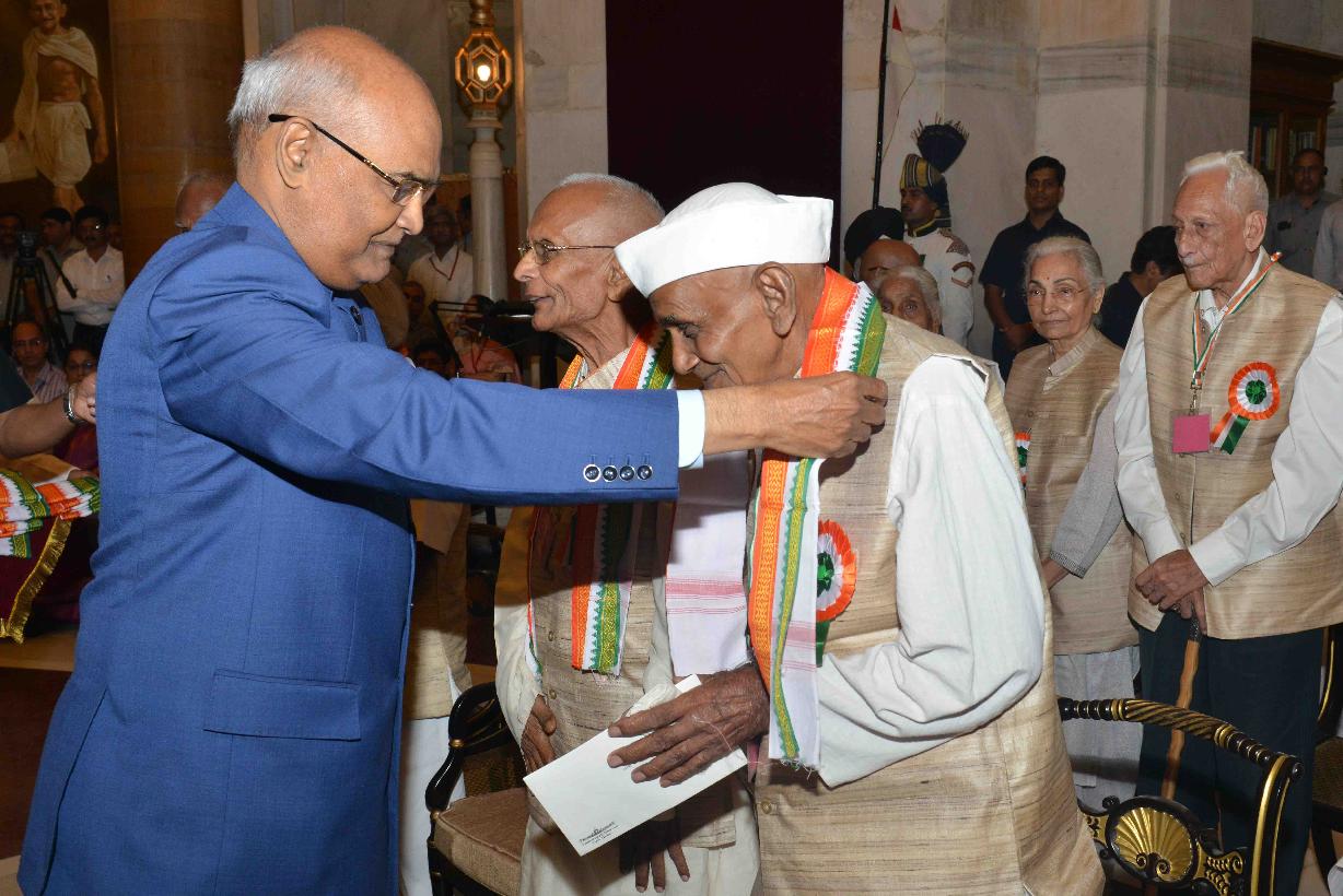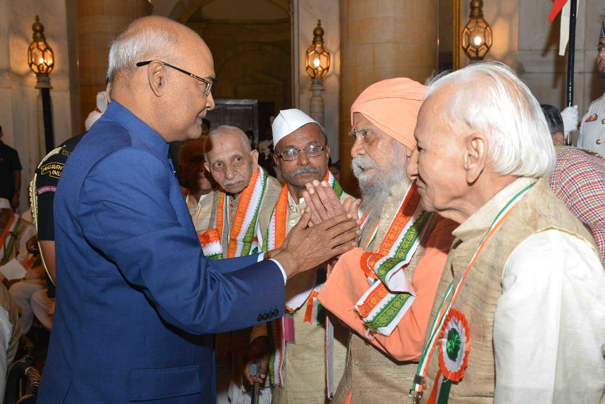 | Caption: | The President of India, Shri Ram Nath Kovind felicitating the Freedom Fighters at the 'At Home Reception for Freedom Fighters, on the occasion of the 75th anniversary of the Quit India Movement, at Rashtrapati Bhavan on August 09, 2017. |