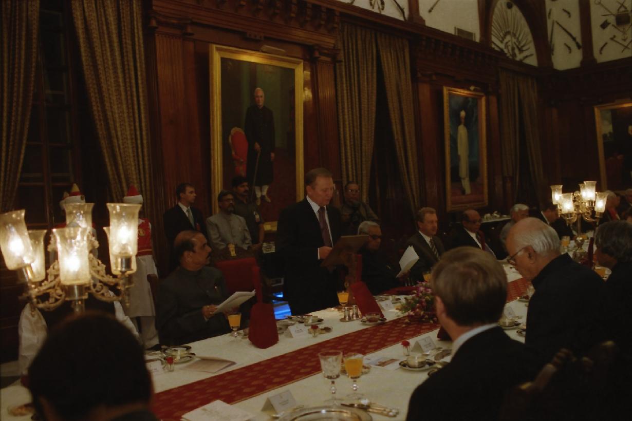 | Caption: | The President of India, Dr A P J Abdul Kalam at the Banquet Hosted in Honour of the President of Ukraine, HE Mr Leonid Kuchma and his wife Mrs Ludmila Kuchma at the Banquet Hall of Rashtrapati Bhavan in New Delhi on Oct 03, 2002 |