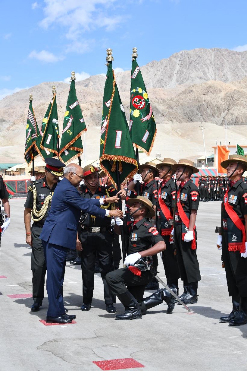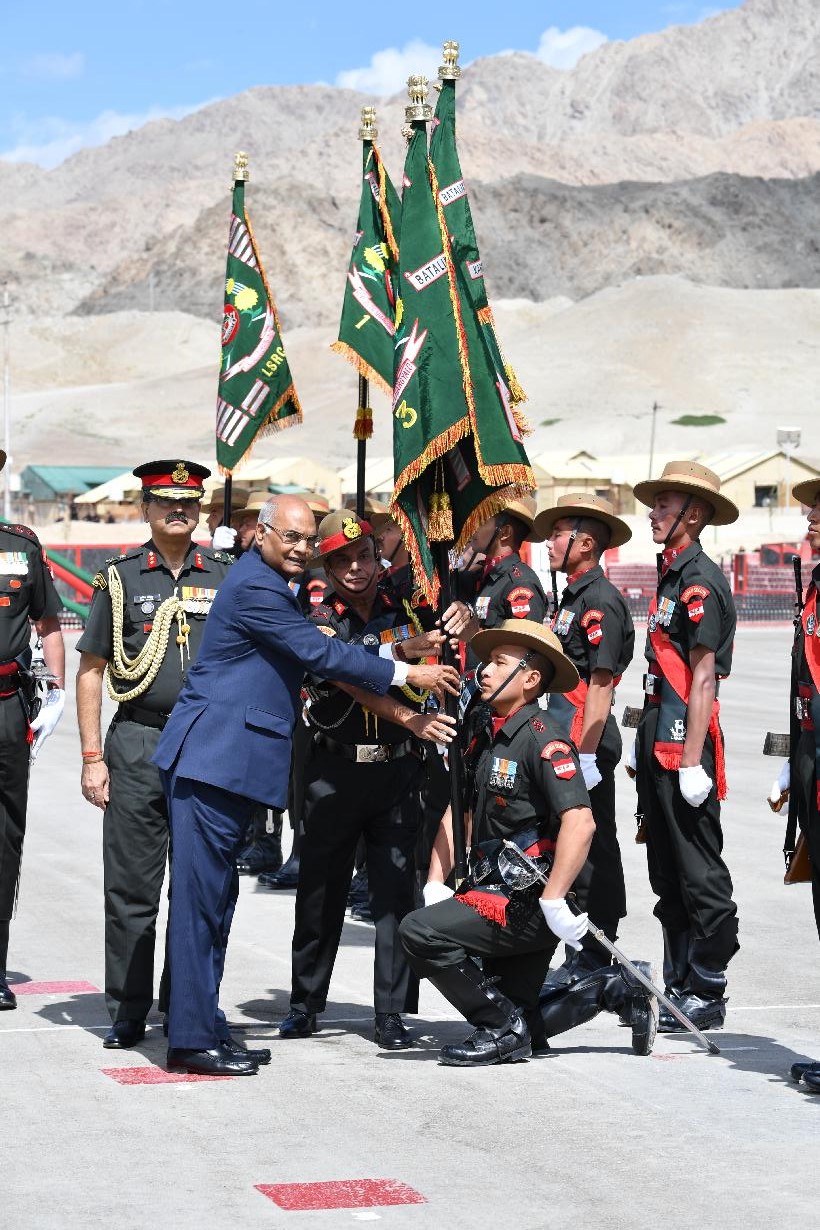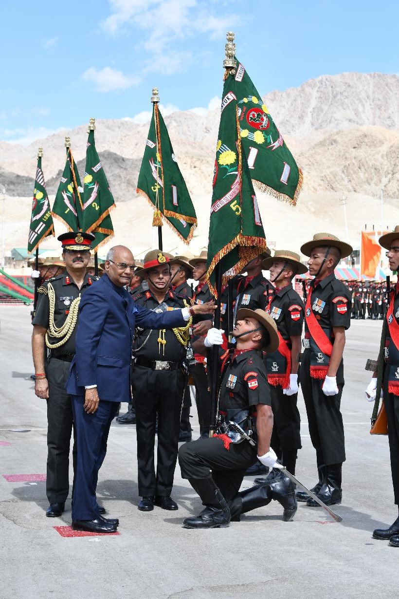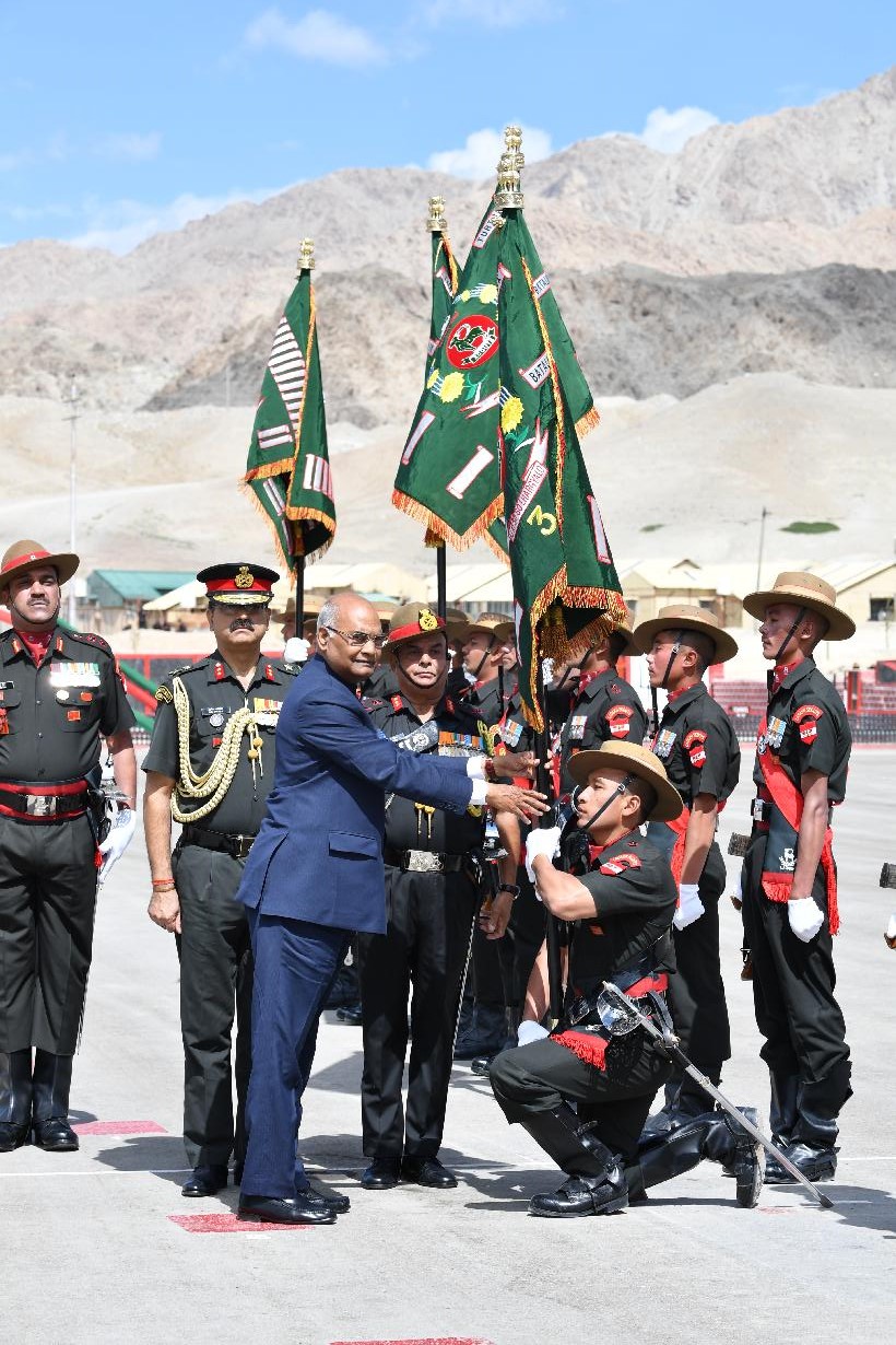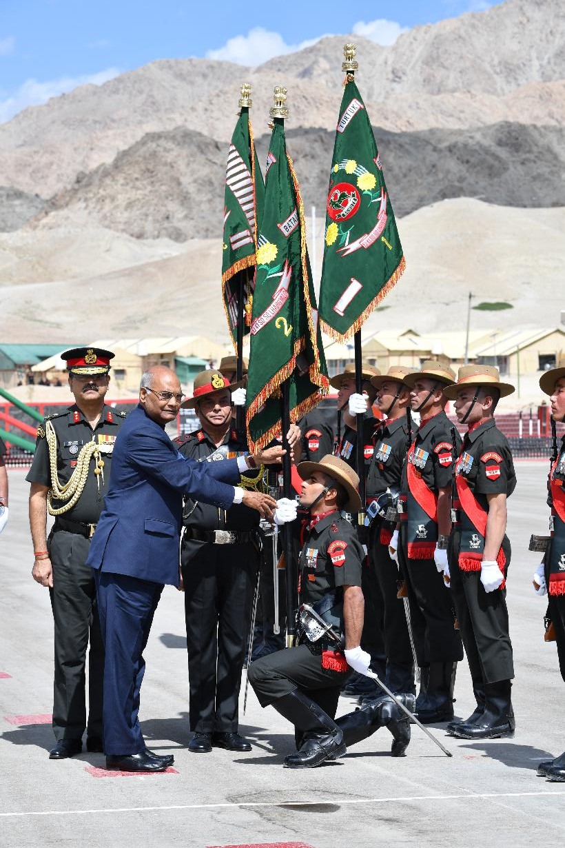 | Caption: | The President of India, Shri Ram Nath Kovind presenting the President s Colours to all five Ladakh Scouts Battalions and Ladakh Scouts Regimental Centre, at Leh, in Jammu & Kashmir on August 21, 2017. |