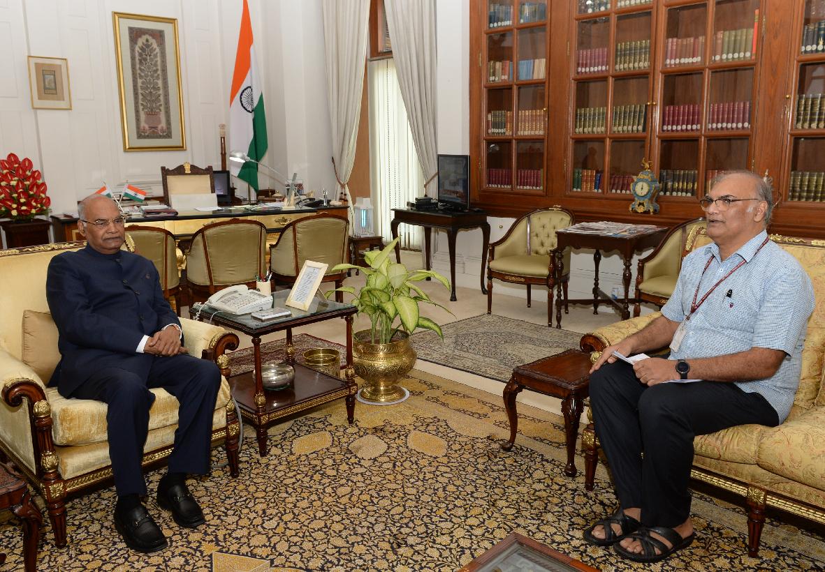 | Caption: | Shri Prabhash Kumar Jha, Secretary, Department of Languages, MHA meeting with the President of India, Shri Ram Nath Kovind, at Rashtrapati Bhavan on August 30, 2017. |
