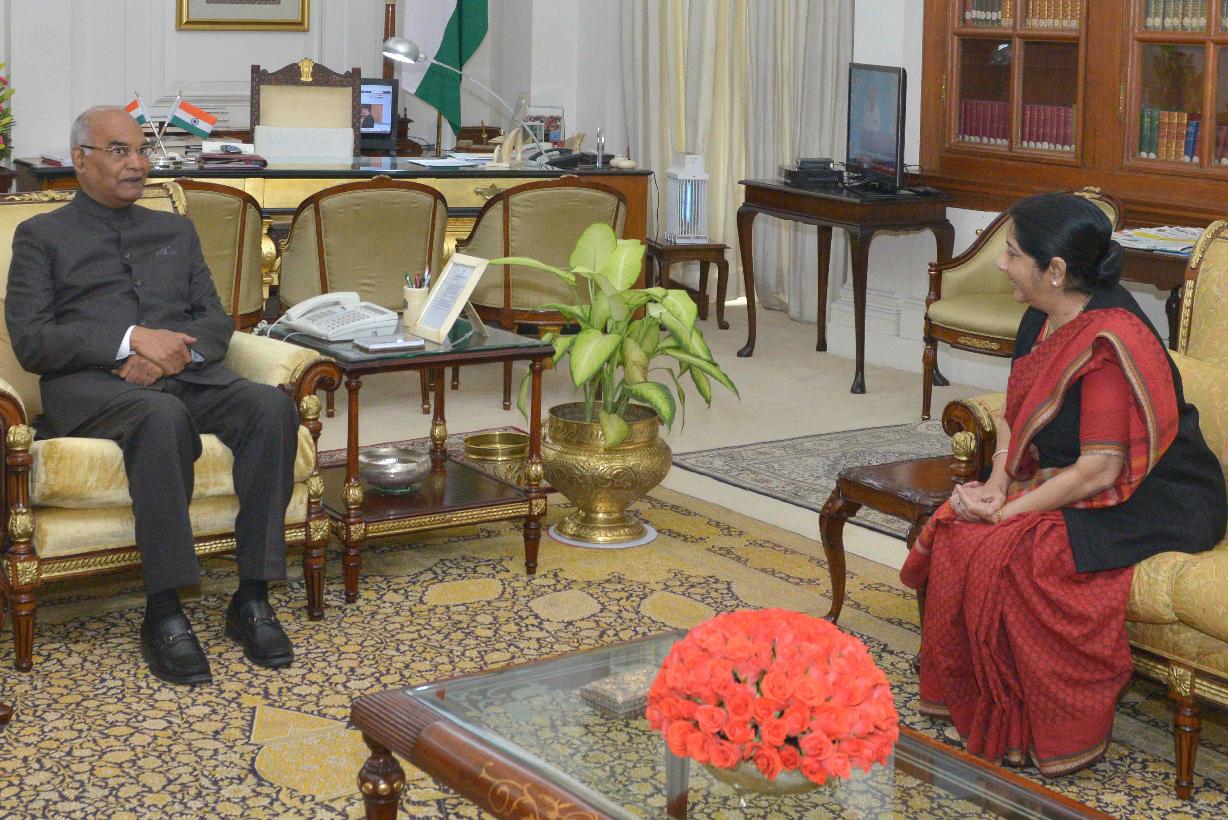 | Caption: | The Minister for External Affairs, Smt. Sushma Swaraj calling on the President of India, Shri Ram Nath Kovind, at Rashtrapati Bhavan on August 29, 2017. |