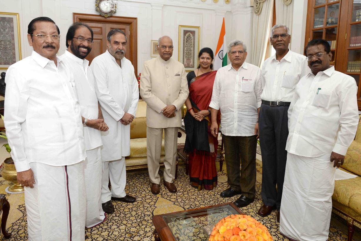 | Caption: | Ms. Kanimozhi, MP (RS) & Leader, DMK Parliamentary Party alongwith a delegation of Members of Parliament from DMK, Congress, CPI & CPI (M) meeting with the President of India, Shri Ram Nath Kovind, at Rashtrapati Bhavan on August 31, 2017. |