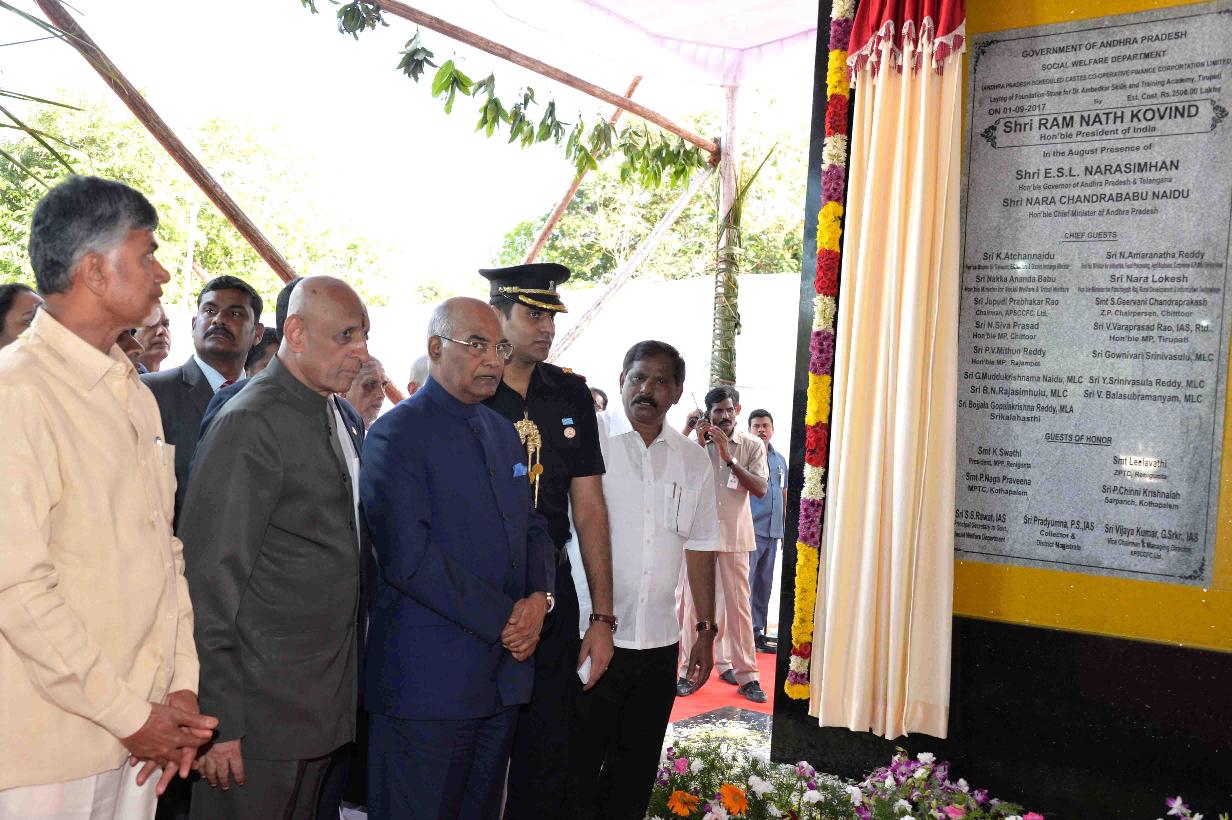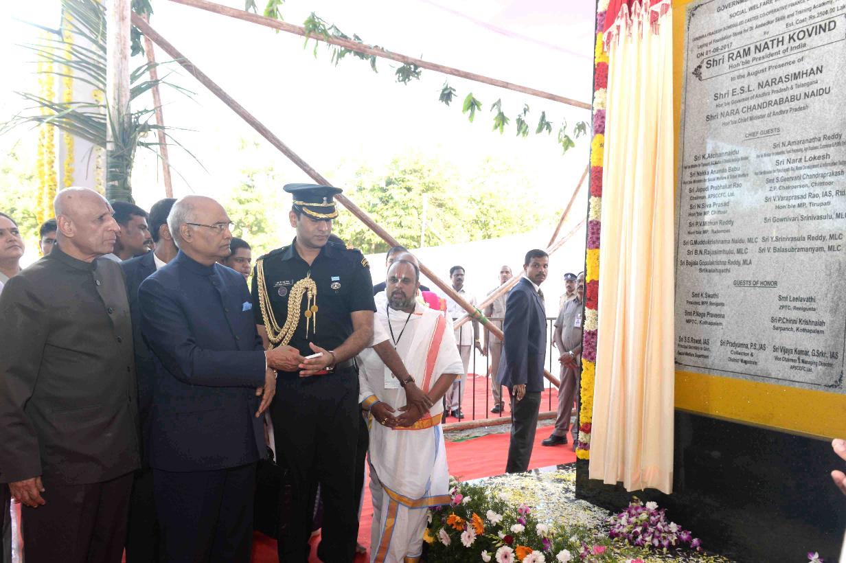 | Caption: | The President of India, Shri Ram Nath Kovind laying the foundation stone for BR Ambedkar Skill Training Academy and presenting sanction letter to one of the beneficiary of the Stand up India initiative and the Land Purchase Scheme, during the Civic Reception, at Sri Venkateswara Arts College Ground, Tirupati, in Andhra Pradesh on September 01, 2017. |