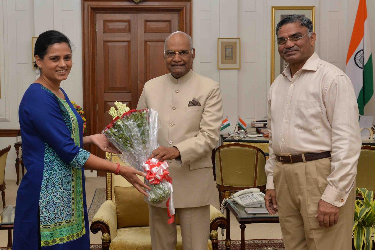 | Caption: | Ms. Srishti Bakshi, Founder CrossBow alongwith her father Lt. Gen. A.K. Bakshi, former MSP to the President meeting with the President of India, Shri Ram Nath Kovind, at Rashtrapati Bhavan on September 06, 2017. |