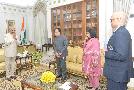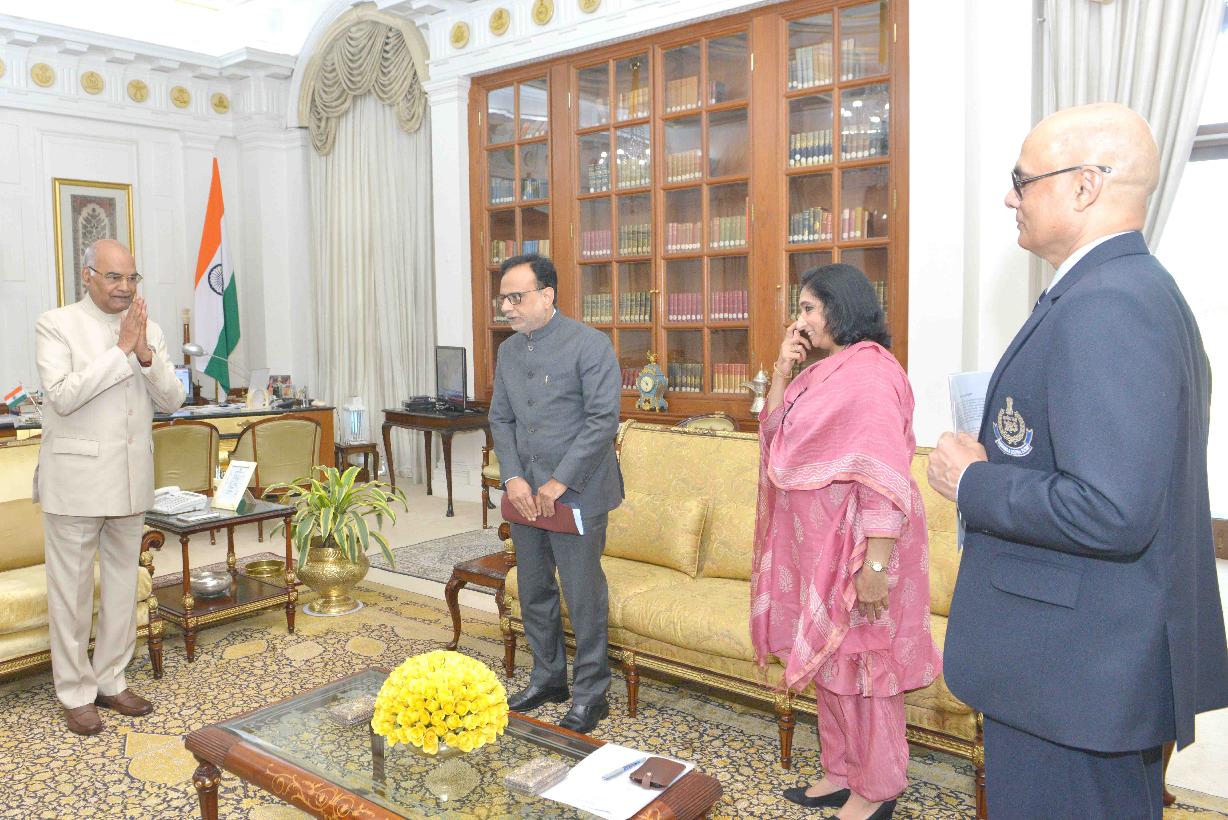 | Caption: | The Revenue Secretary, Dr. Hasmukh Adhia, the Chairman, Central Board of Excise & Customs (CBEC), Ms. Vanaja N. Sarna and the Director General, National Academy of Customs, Excise & Narcotics (NACEN), Shri P.K. Dash meeting with the President of India, Shri Ram Nath Kovind, at Rashtrapati Bhavan on September 06, 2017. |