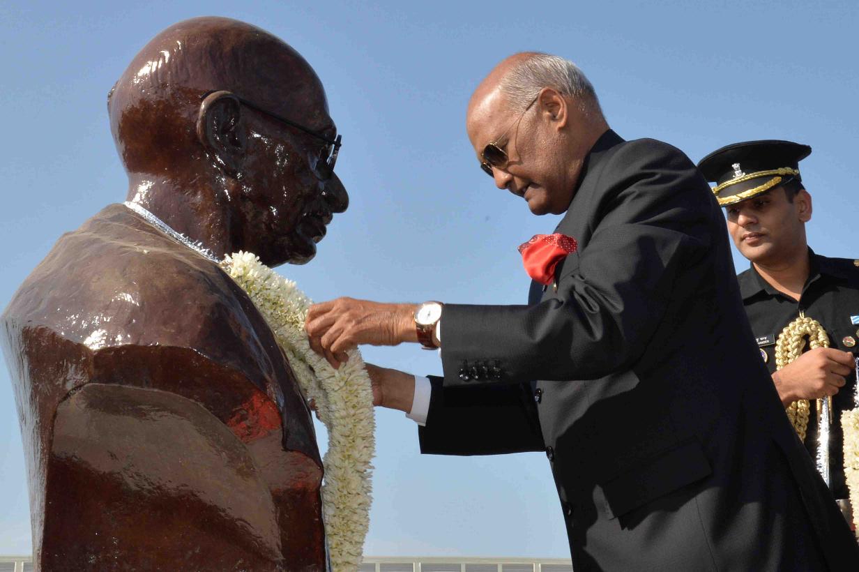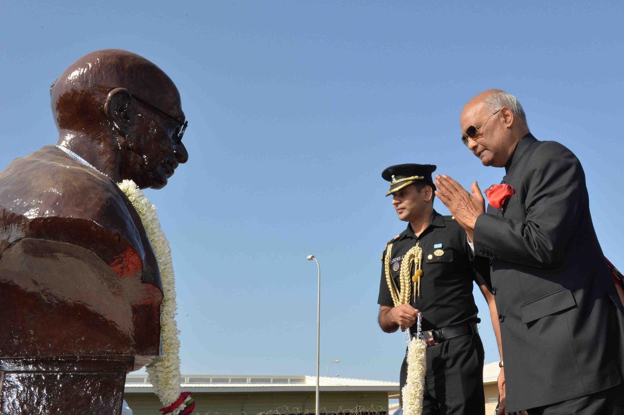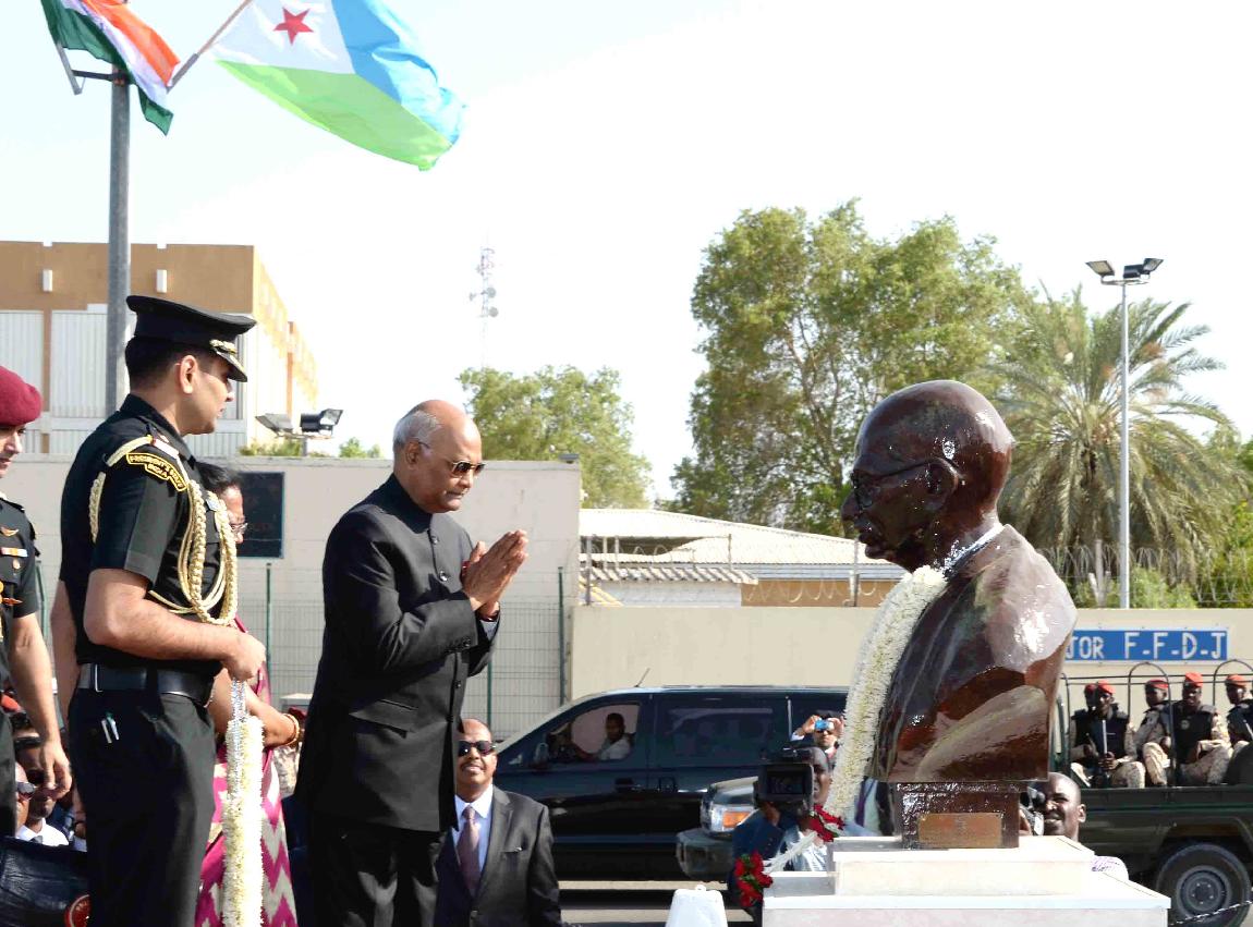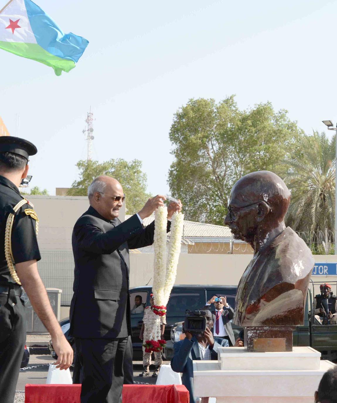 | Caption: | The President of India, Shri Ram Nath Kovind garlanding at the bust of Mahatma Gandhi, at Nelson Mandela Avenue, in Djibouti on October 03, 2017. |