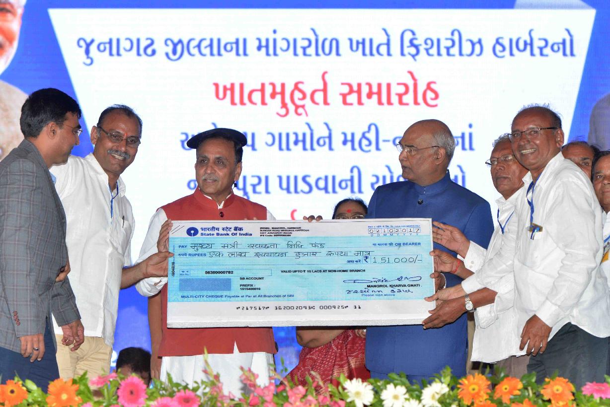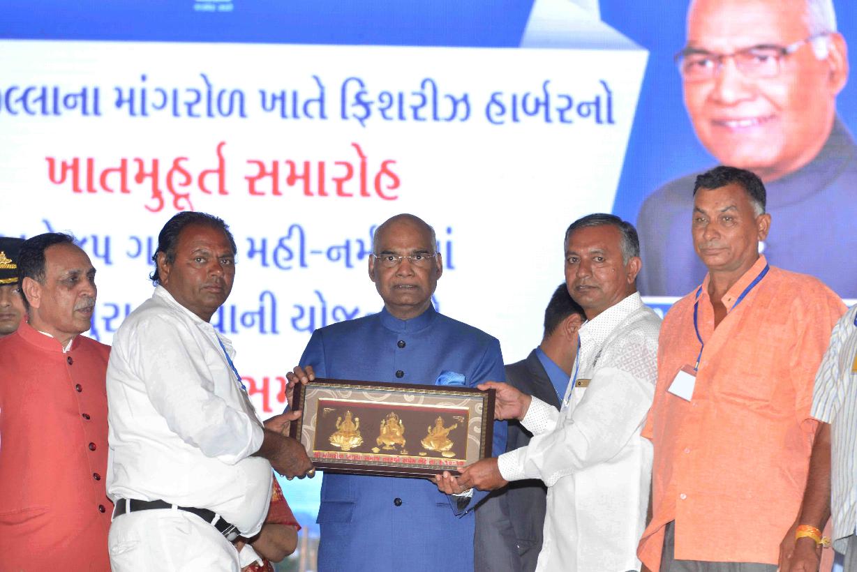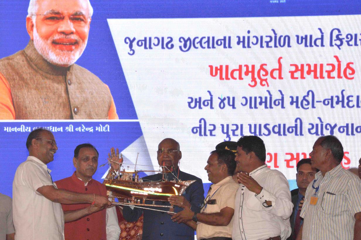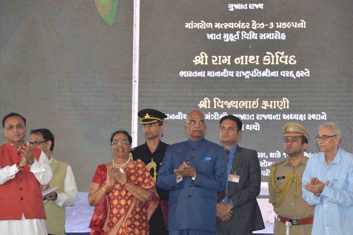 | Caption: | The President of India, Shri Ram Nath Kovind laid the foundation stone of various projects pertaining to the economic advancement of traditional fisherfolk communities, at Mangrol, in Gujarat on October 02, 2017. |