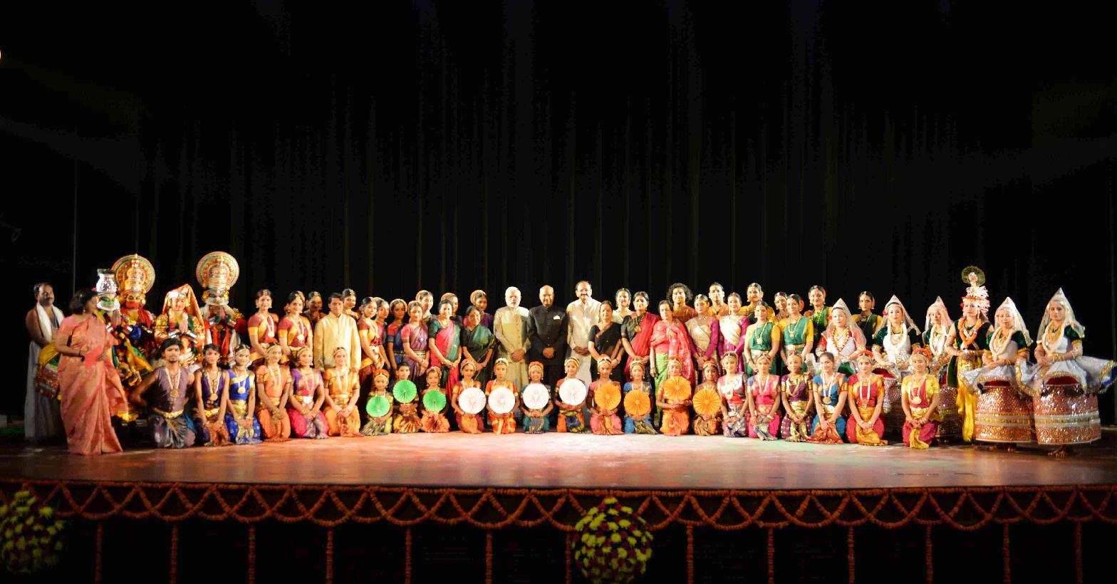 | Caption: | The President of India, Shri Ram Nath Kovind, the Vice President of India, Shri M. Venkaiah Naidu and the Prime Minister of India, Shri Narendra Modi with artists after witnessing a cultural programme presented by Smt. Madhavi Mudgal, Smt. Saroja Vaidyanathan and the children of National Bal Bhavan for the participants of the Conference of Governors-2017 at Rashtrapati Bhavan Auditorium on October 12, 2017. |