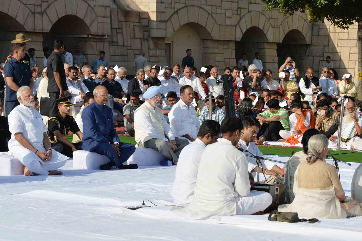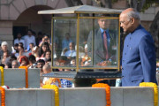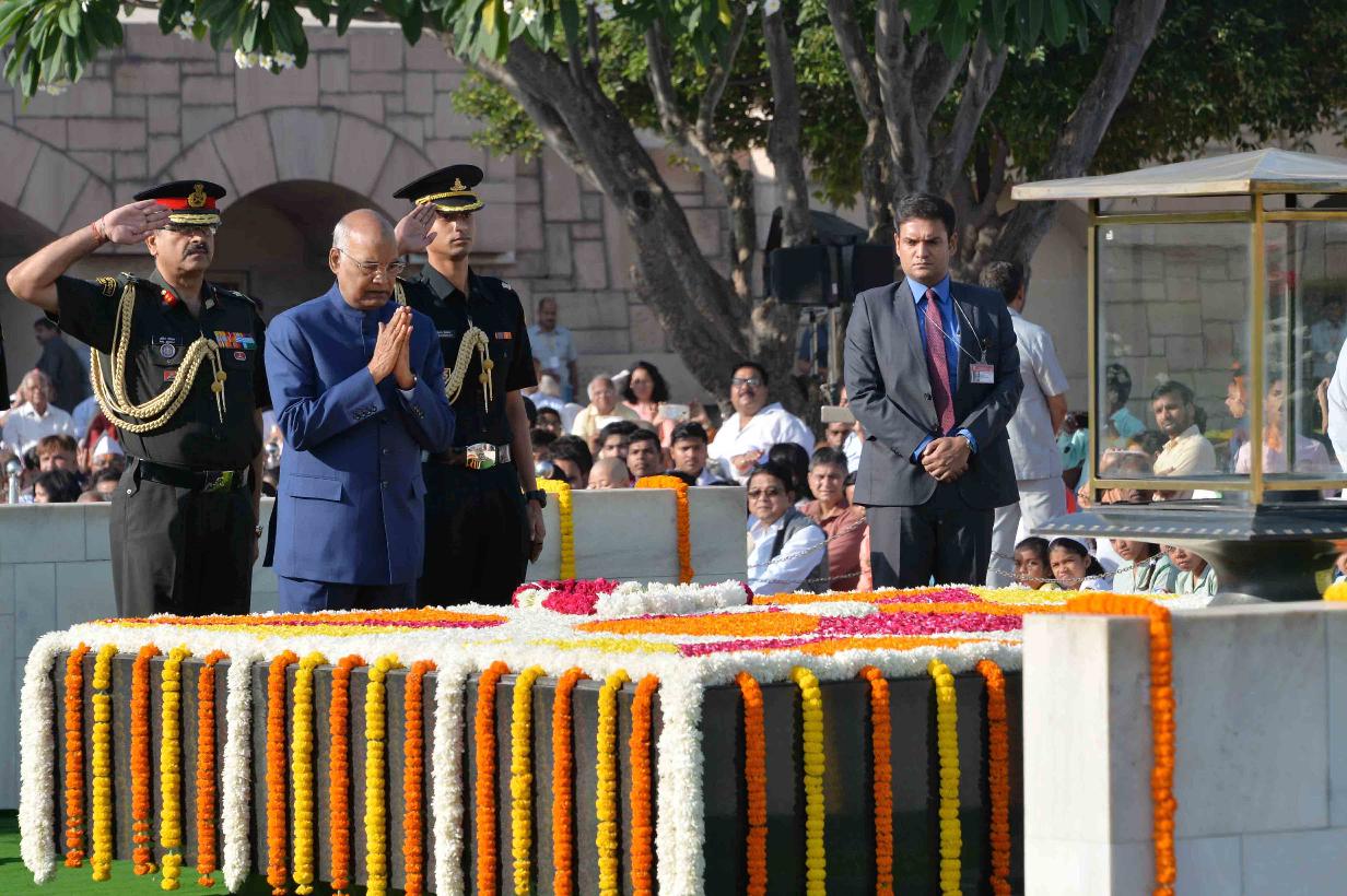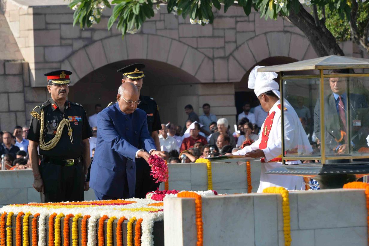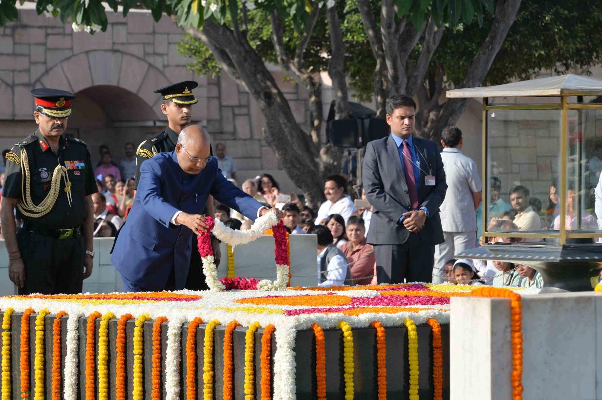 | Caption: | The President of India, Shri Ram Nath Kovind paying floral tributes at the Samadhi of Mahatma Gandhi, on the occasion of his 148th Birth Anniversary, at Rajghat, in New Delhi on October 02, 2017. |