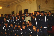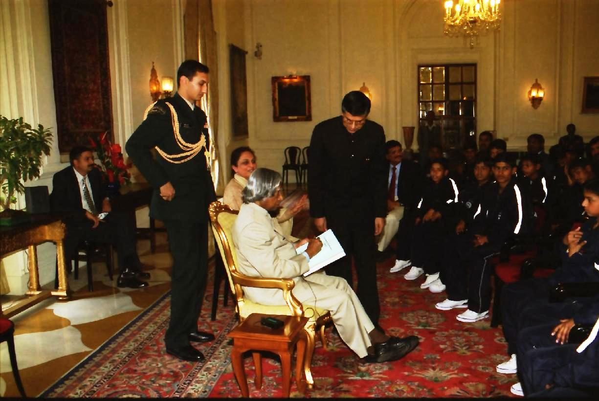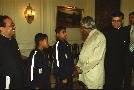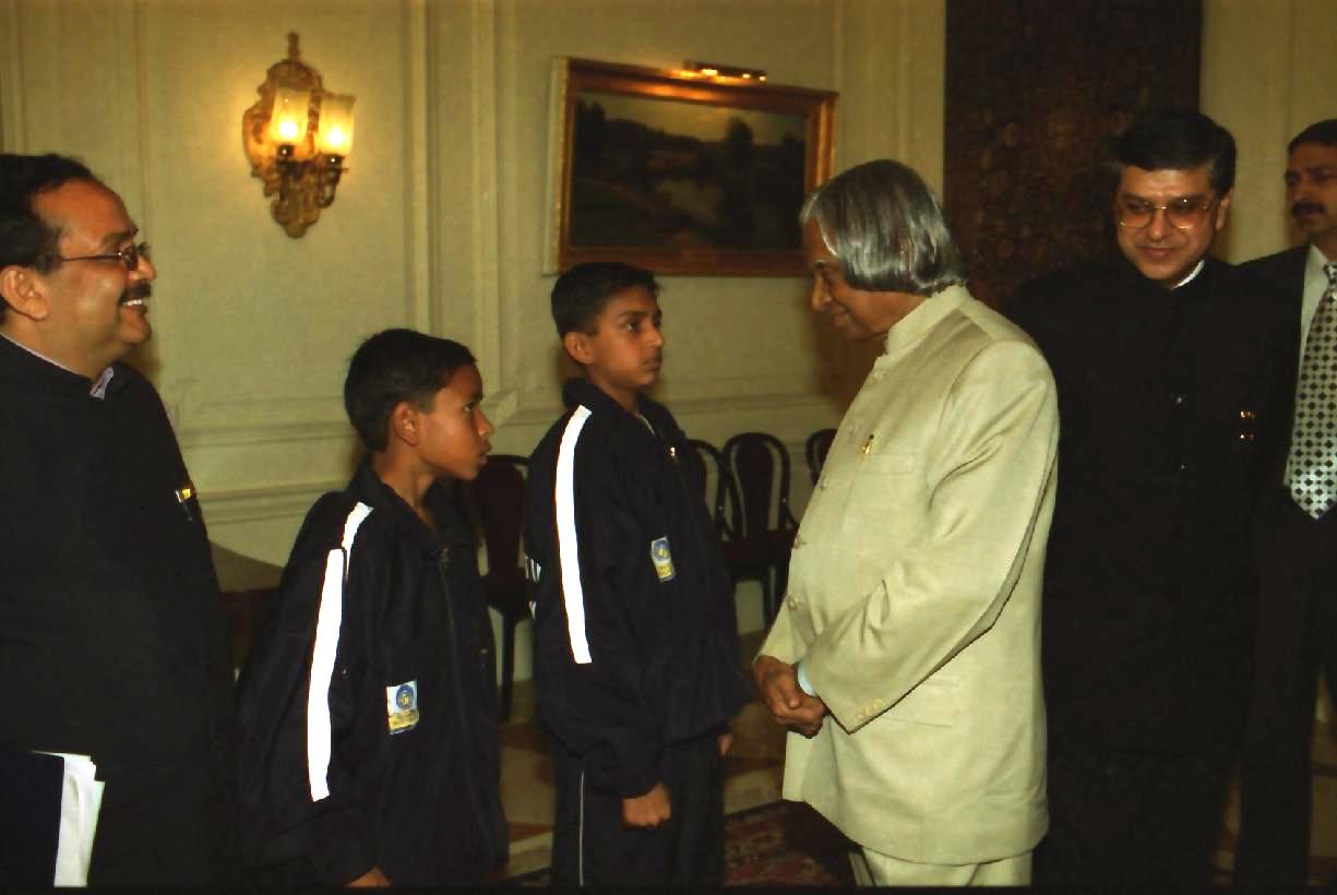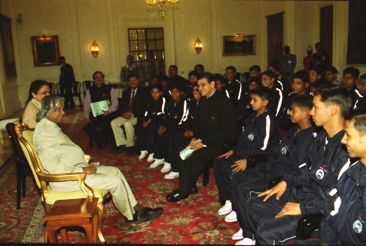 | Caption: | The President of India, Dr A P J Abdul Kalam meeting with the Children and Officials of Allahabad Sporting Club at the Yellow Drawing Room of Rashtrapati Bhavan in New Delhi on Feb 18, 2003 |