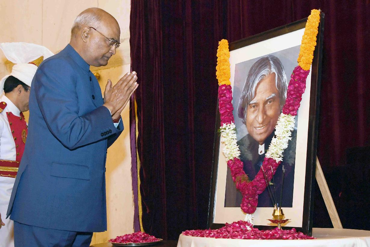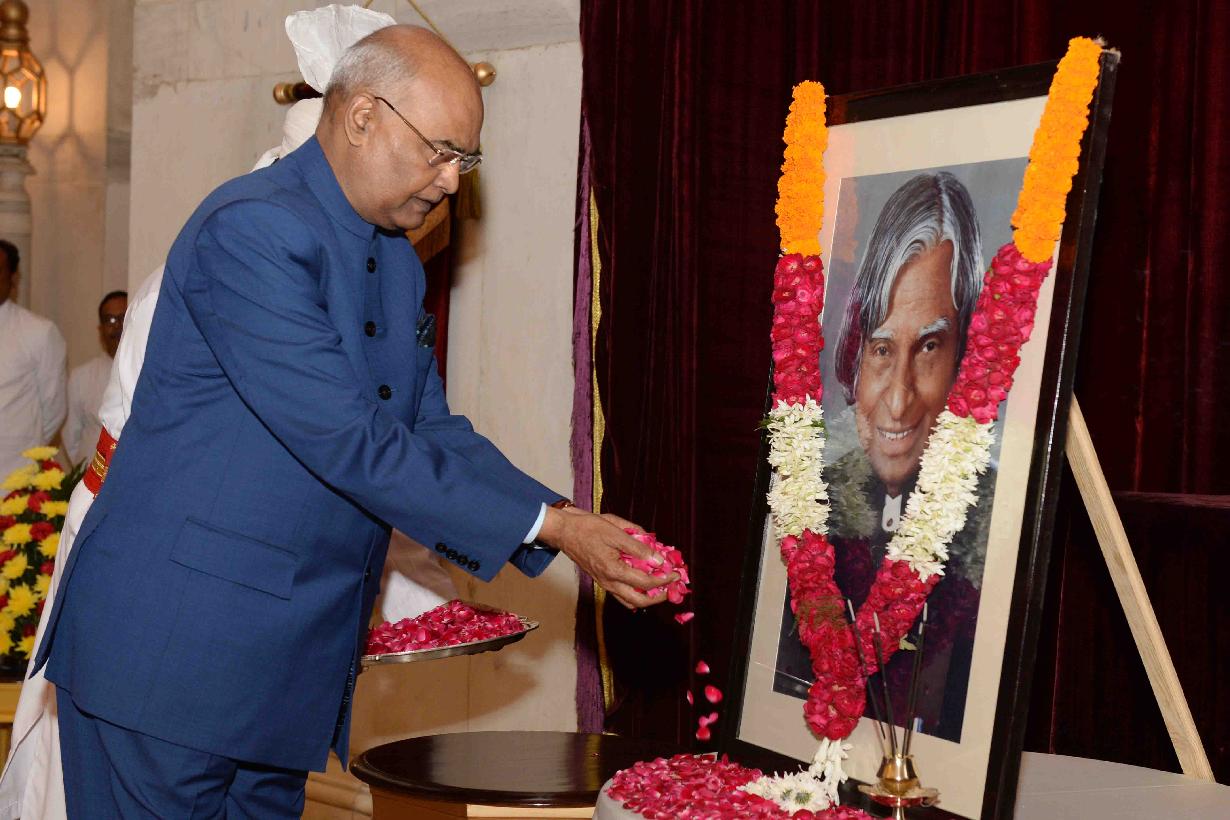 | Caption: | The President of India, Shri Ram Nath Kovind paying floral tributes to Dr. APJ Abdul Kalam, former President of India on the occasion of his Birth Anniversary, at Rashtrapati Bhavan on October 15, 2017. Family members of Dr. APJ Abdul Kalam also paid tributes to him. |