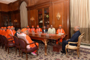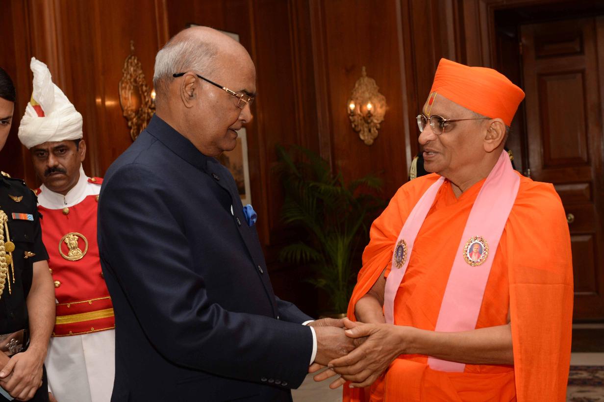 | Caption: | Shri Purushottampriyadasji Maharaj, Gaddipati, Shree Swaminarayan Temple Sevashram, Maninagar, Ahmedabad with others meeting with the President of India, Shri Ram Nath Kovind, at Rashtrapati Bhavan on September 27, 2017. |