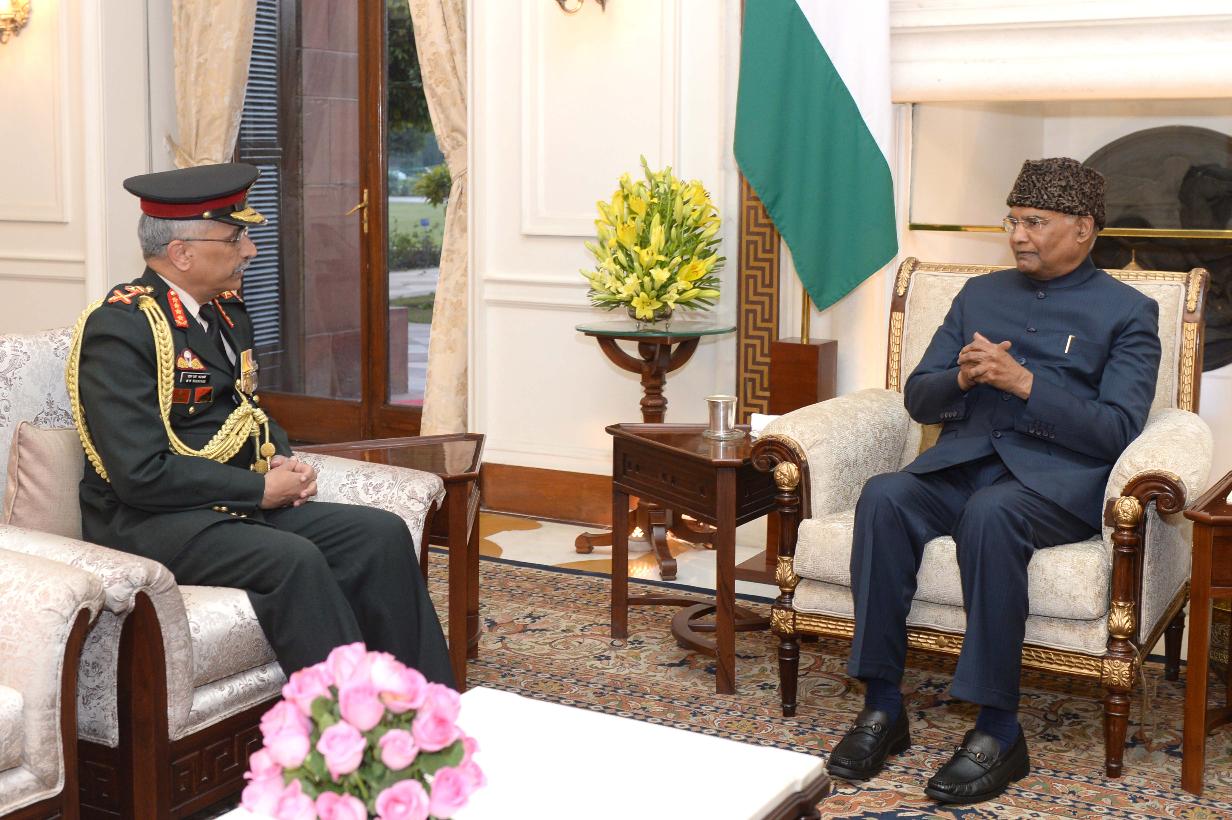 | Caption: | The Chief of the Army Staff, General M.M. Naravane meeting with the President of India, Shri Ram Nath Kovind, at Rashtrapati Bhavan on January 03, 2020. |