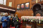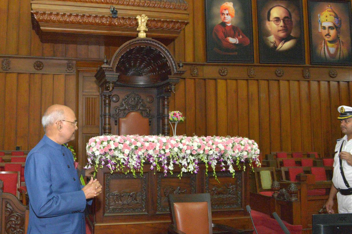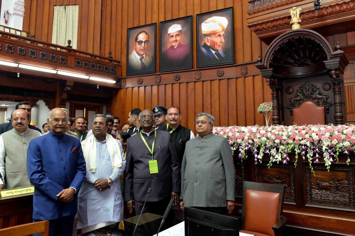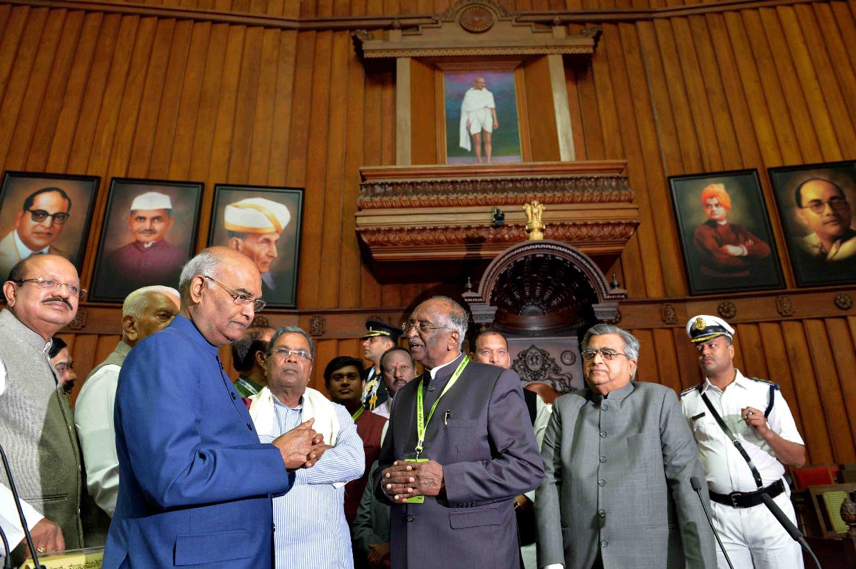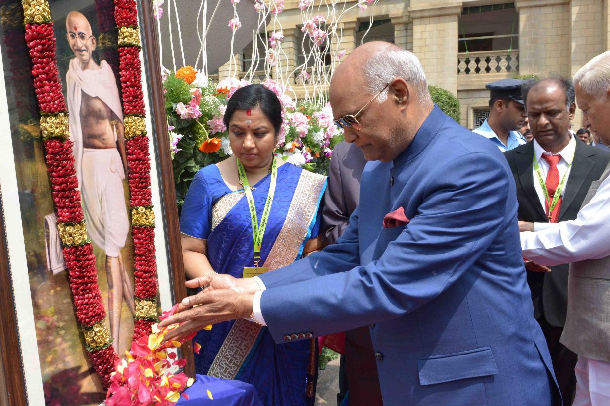 | Caption: | The President of India, Shri Ram Nath Kovind visiting the Karnataka Legislative Council Hall and paying floral tributes at the portrait of Mahatma Gandhi, at Bengaluru, in Karnataka on October 25, 2017. |