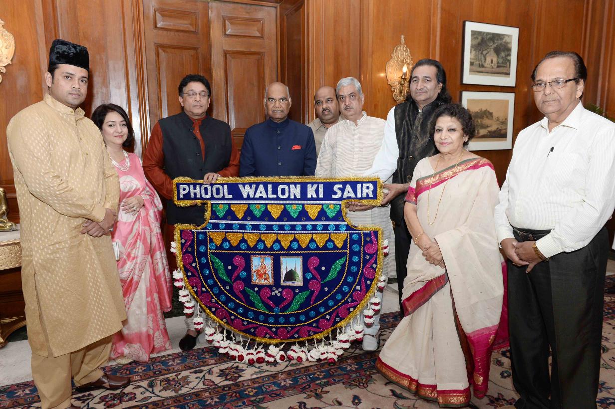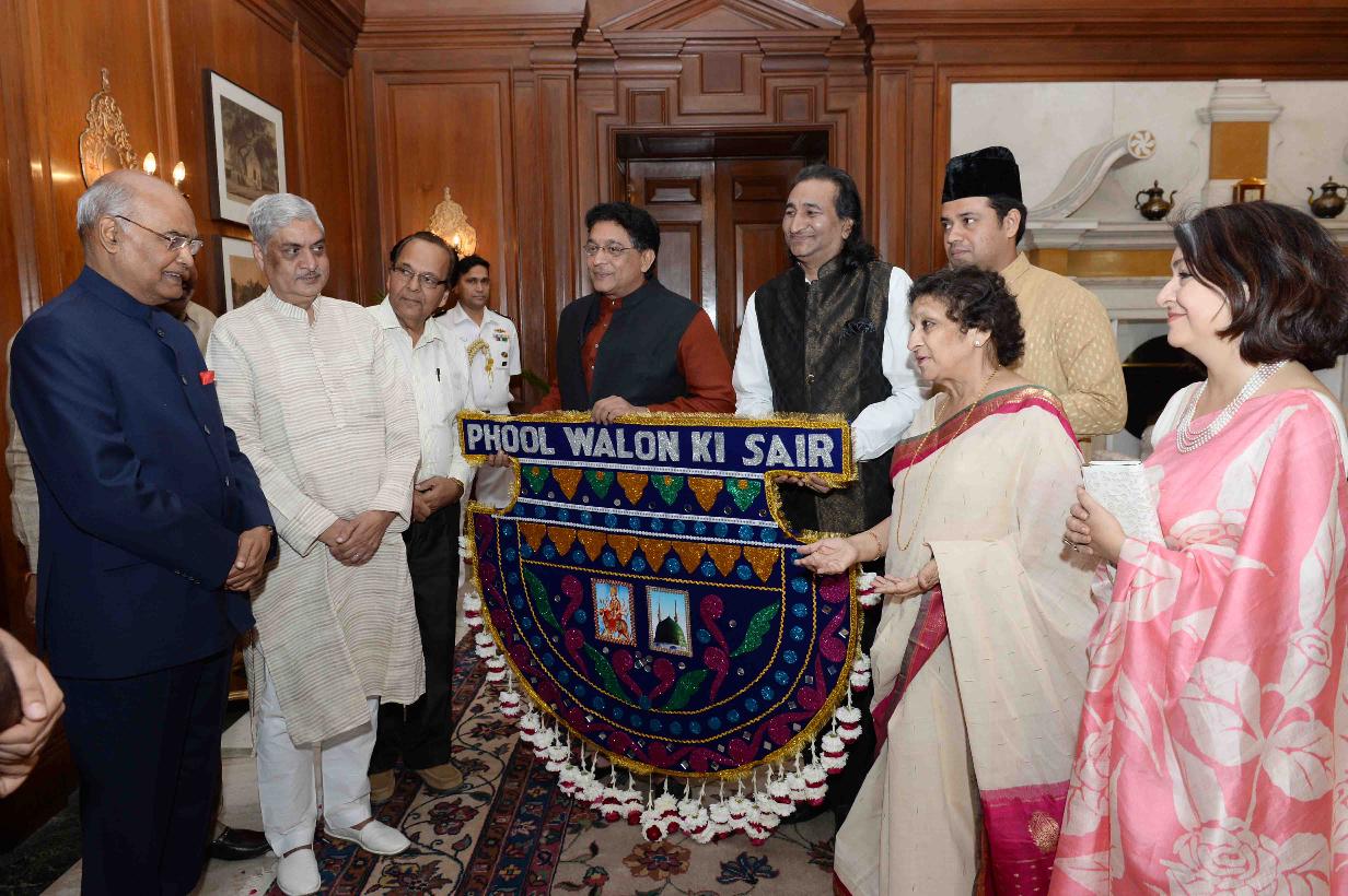 | Caption: | Smt. Usha Kumar, General Secretary, Anjuman Sair-e-Gul Faroshan with others presenting a Pankha of Phool Waalon Ki Sair to the President of India, Shri Ram Nath Kovind, at Rashtrapati Bhavan on October 31, 2017. |
