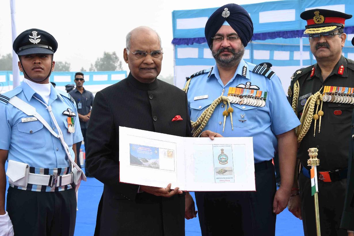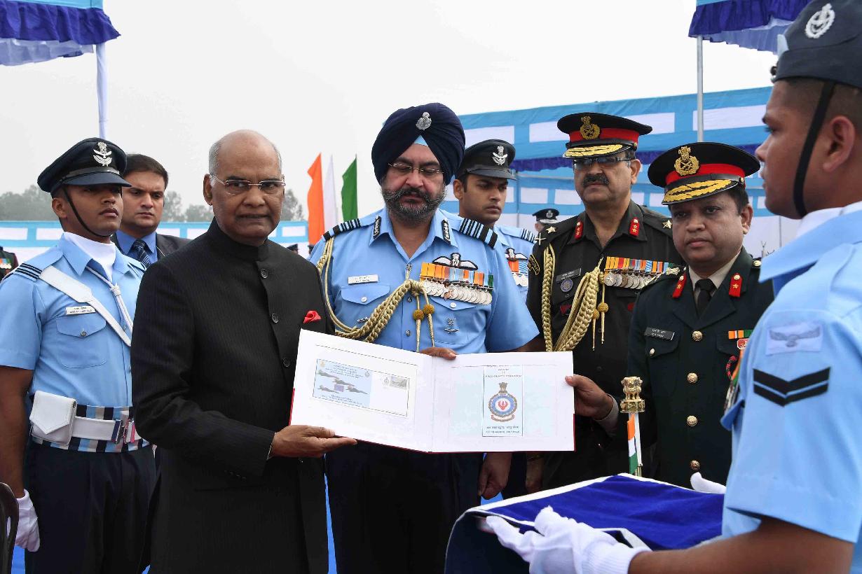 | Caption: | The President of India, Shri Ram Nath Kovind releasing the Special Cover, at the presentation of Standards to 117 HU and 223 SQN of Indian Air Force, at Adampur, in Punjab on November 16, 2017. |