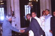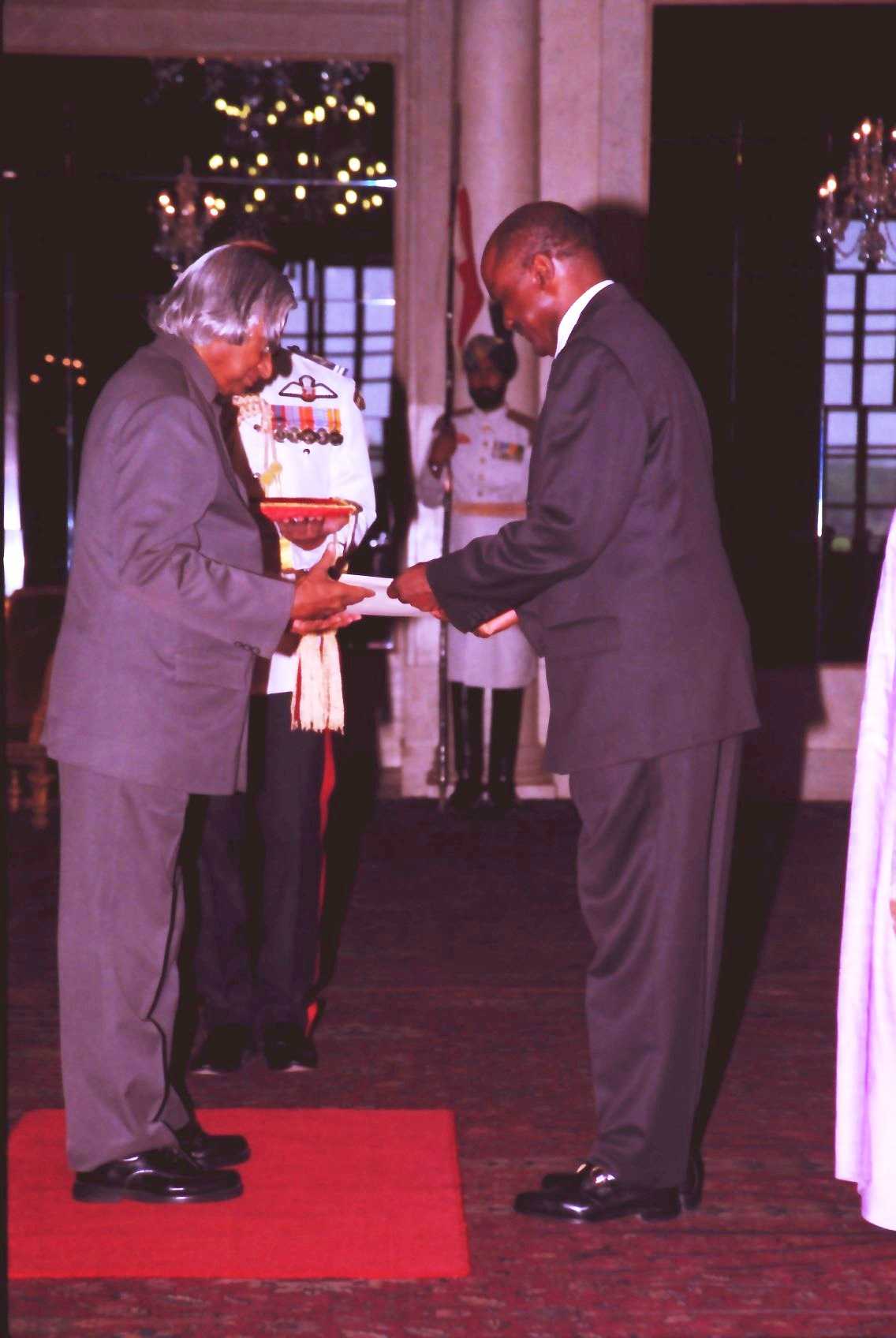 | Caption: | The High Commissioner-Designate of Namibia to India, HE Maj Gen Charles Dicson Ndaxu Phillip Namoloh presenting his credentials to the President of India, Dr A P J Abdul Kalam at the Ashok Hall of Rashtrapati Bhavan in New Delhi on April 16, 2003 |