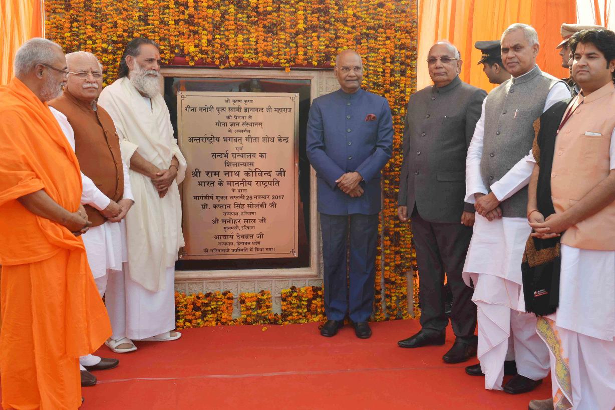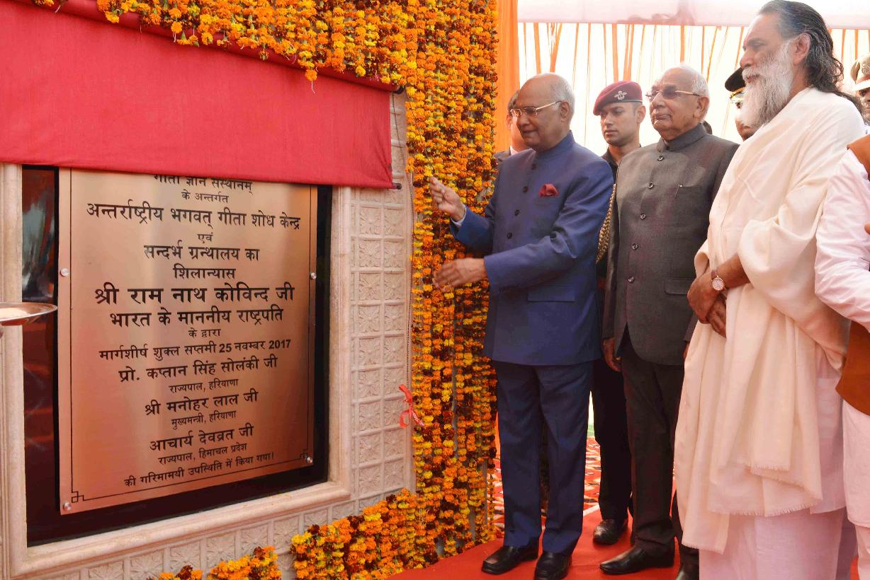 | Caption: | The President of India, Shri Ram Nath Kovind laying the foundation stone of Gita Research Centre, at Kurukshetra, in Haryana on November 25, 2017. |