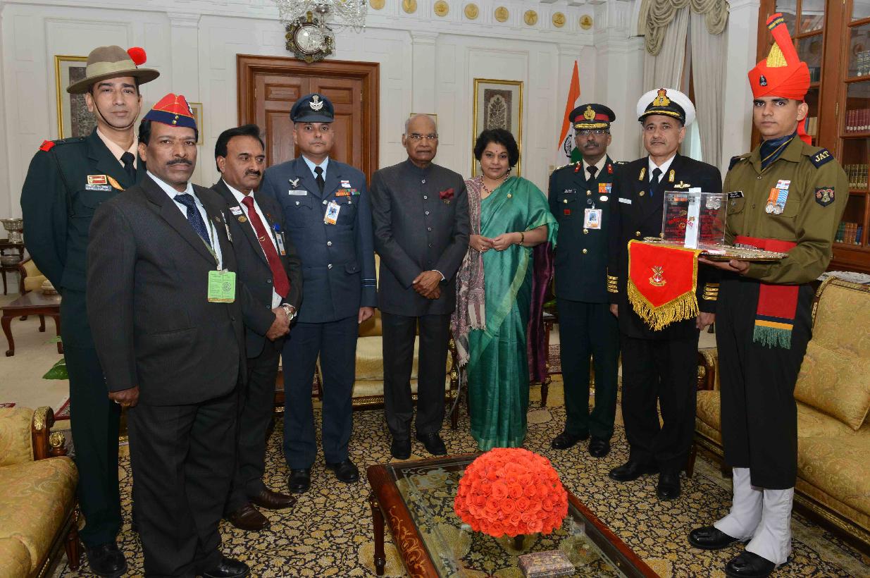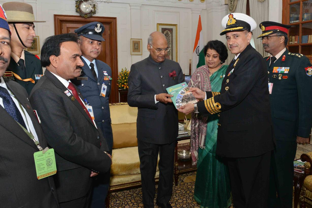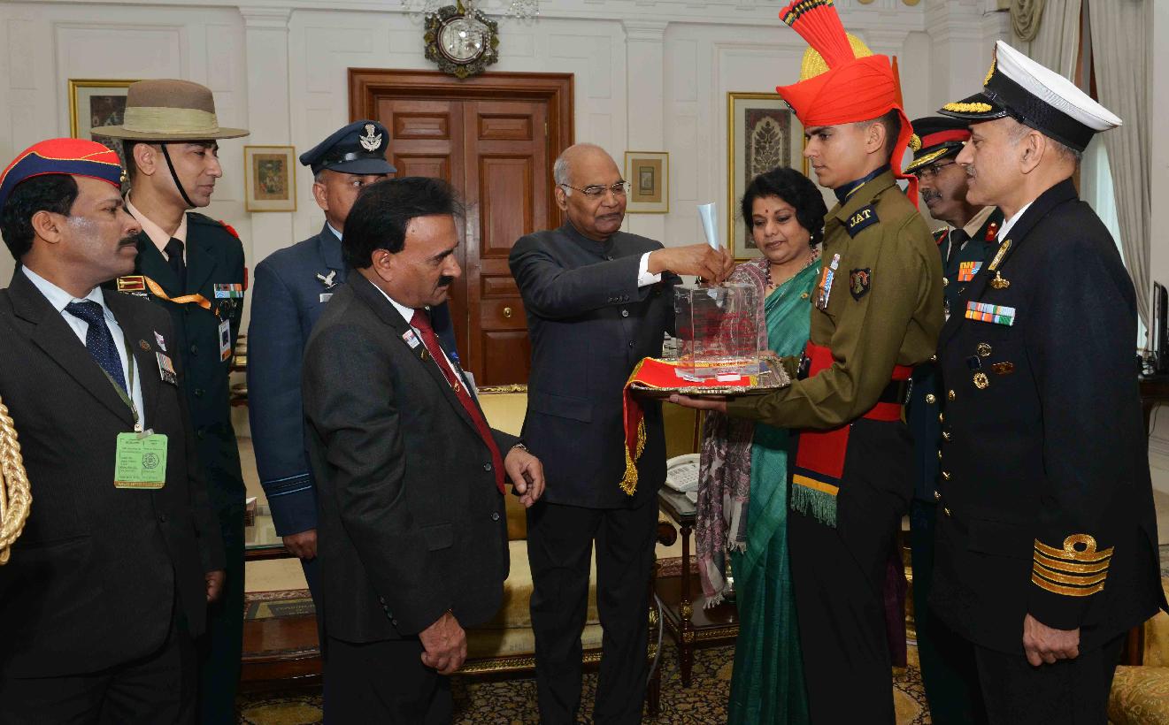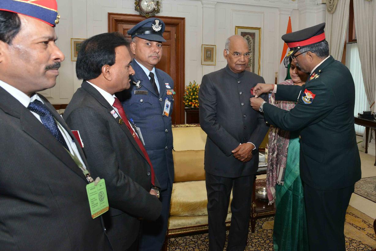 | Caption: | Brig. M. Haider Rizvi, Secretary with others from Kendriya Sainik Board, Ministry of Defence pinning a flag on the President of India, Shri Ram Nath Kovind, on the occasion of Armed Forces Flag Day, at Rashtrapati Bhavan on December 07, 2017. |