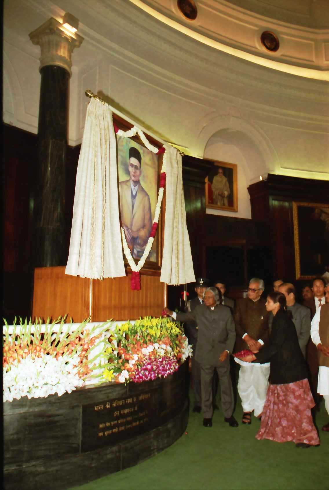 | Caption: | The President of India, Dr A P J Abdul Kalam being unveiled the Portrait of Swatantryaveer Vinayak Damodar Savarkar in the Central Hall of Parliament House in New Delhi on Feb 26, 2003 |