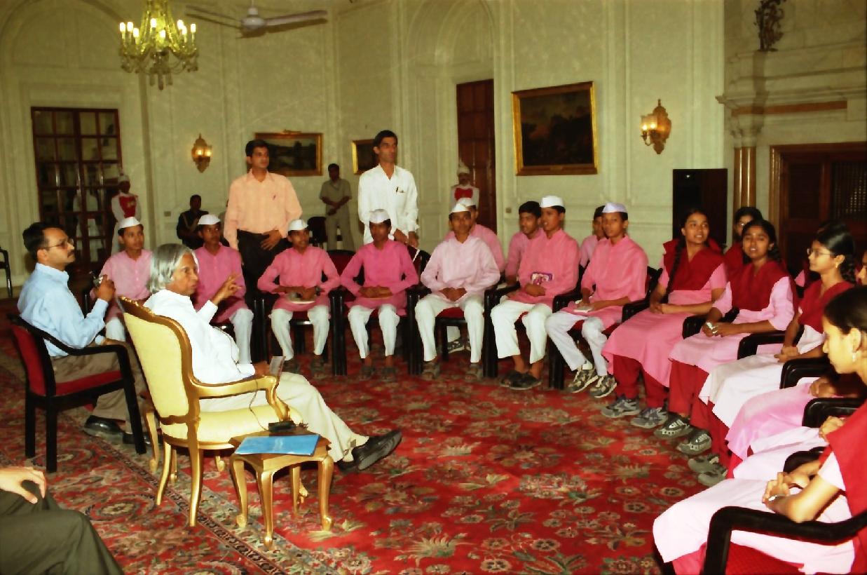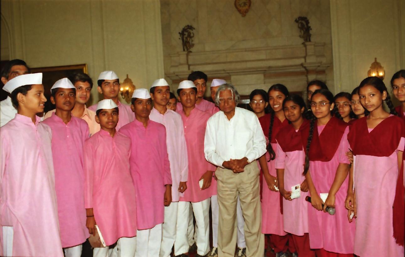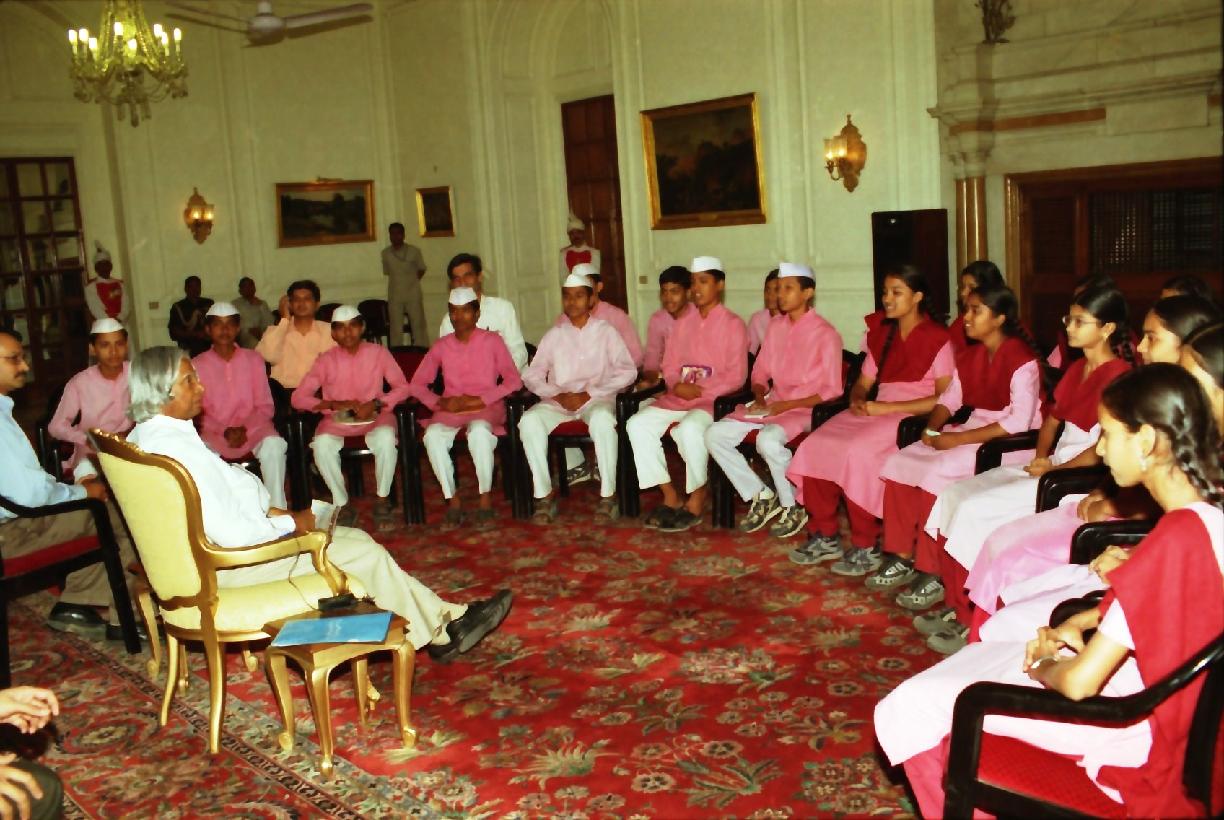 | Caption: | The Students and Teachers from Jnana Prabodhini Navanagar Vidyalaya Pune calling on the President of India, Dr A P J Abdul Kalam at the Yellow Drawing Room of Rashtrapati Bhavan in New Delhi on April 22, 2003 |