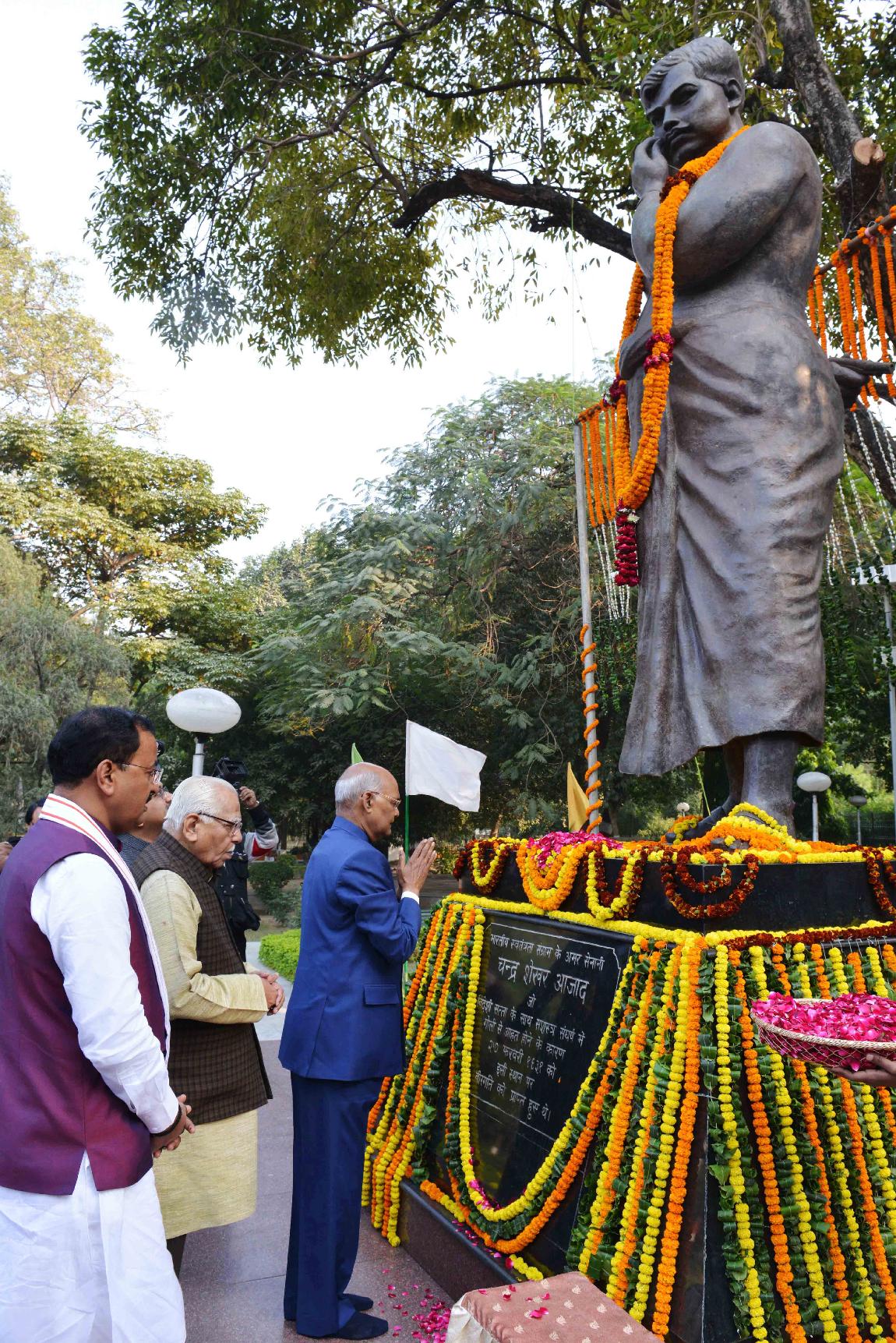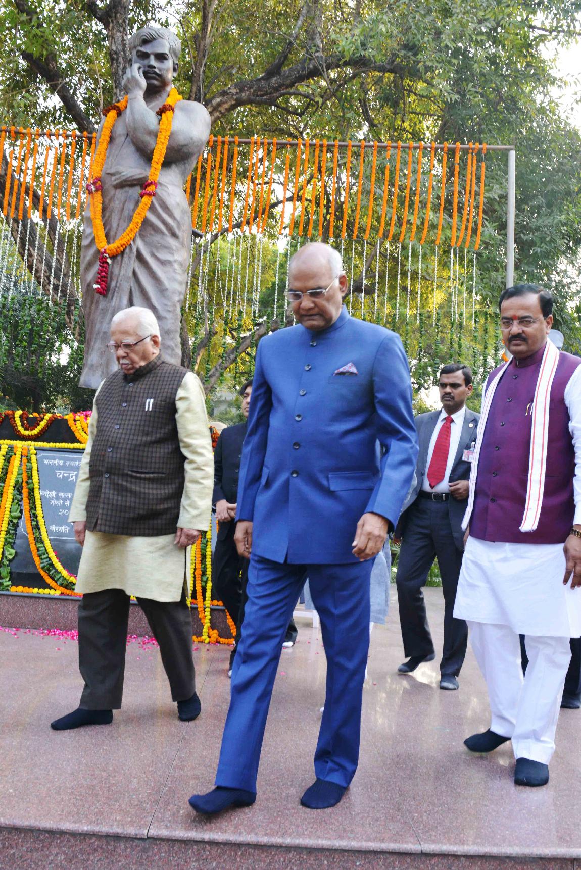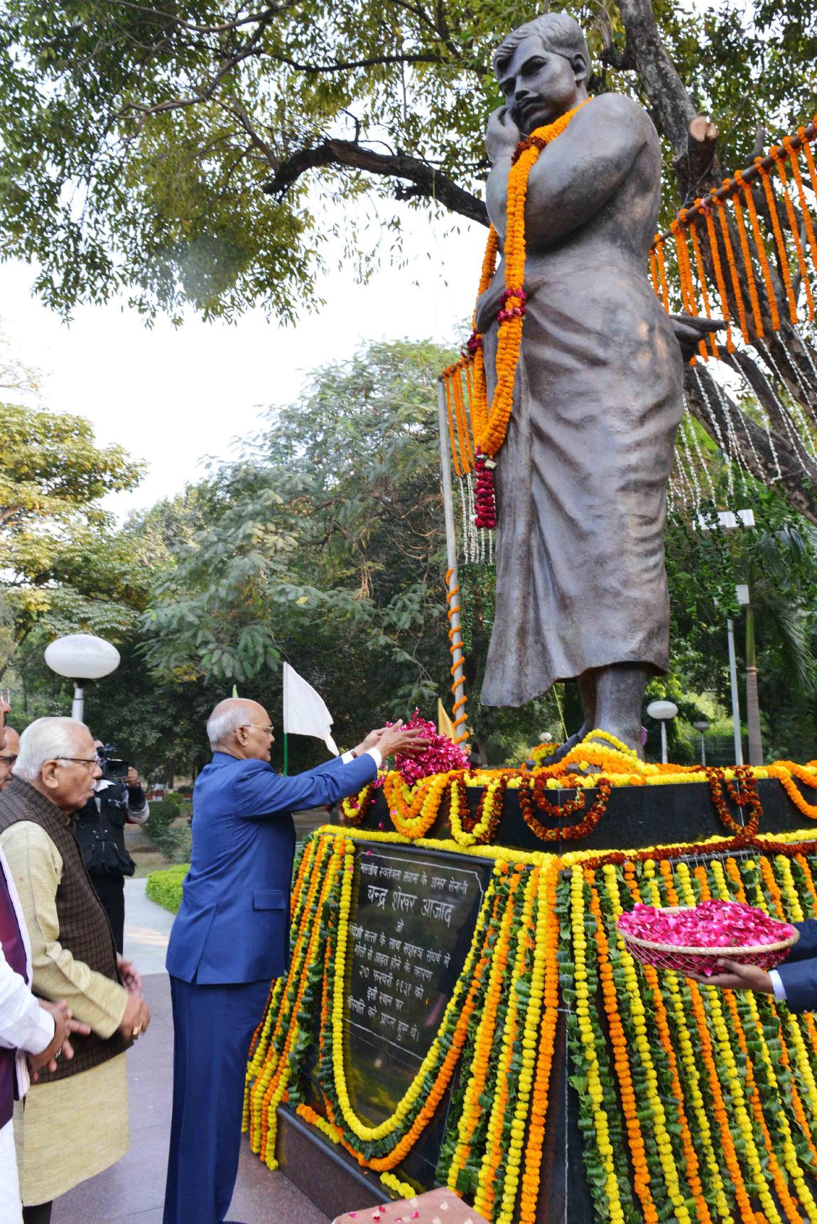 | Caption: | The President of India, Shri Ram Nath Kovind paying floral tributes at the Statue of Shri Chandra Sekhar Azad, at Allahabad, in Uttar Pradesh on December 15, 2017. |