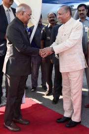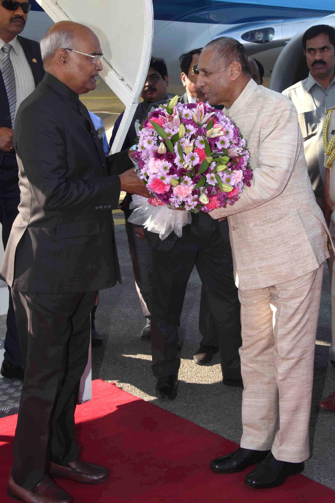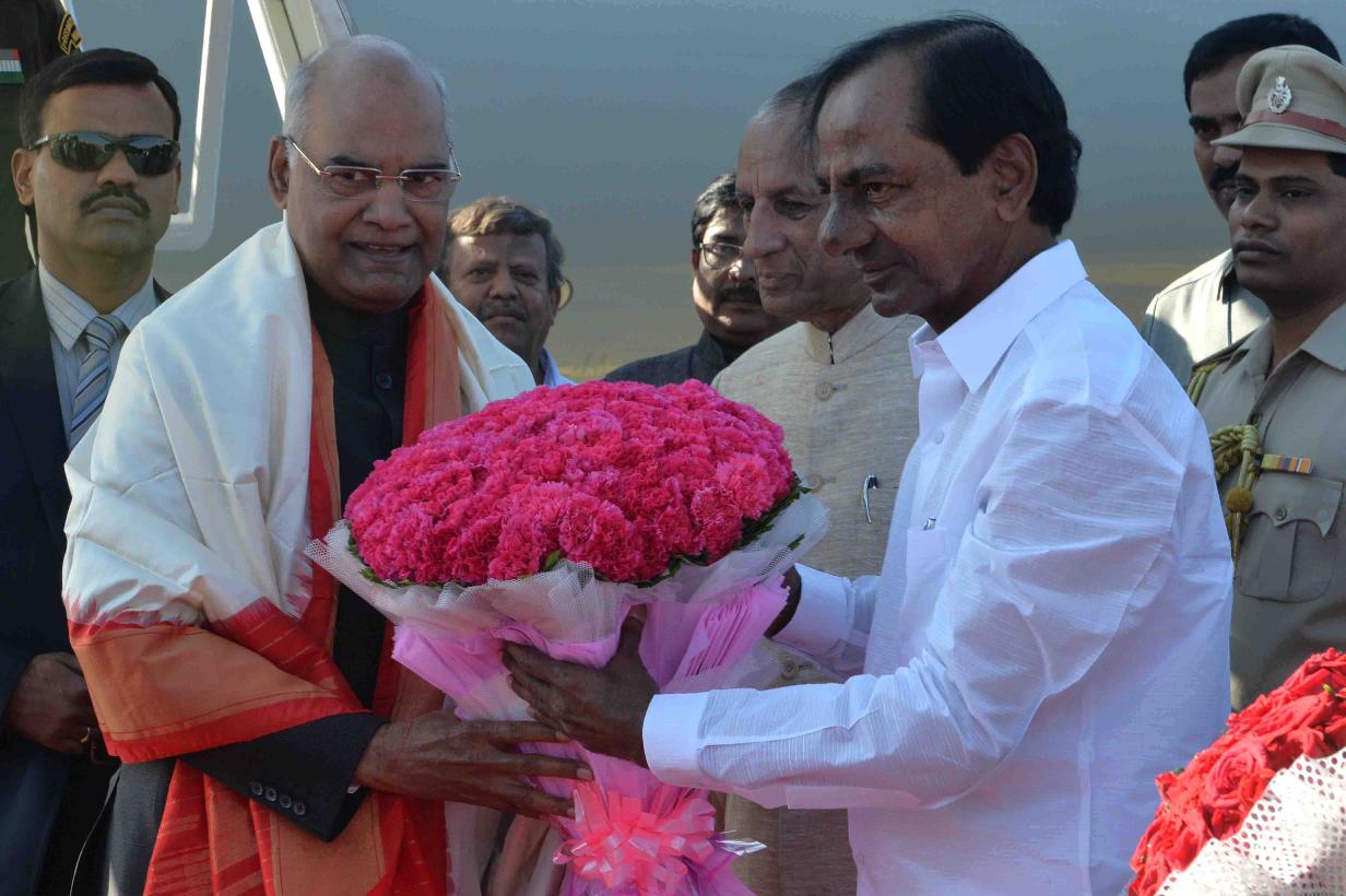 | Caption: | The President of India, Shri Ram Nath Kovind being received by the Governor of Andhra Pradesh and Telangana, Shri E.S.L. Narasimhan and the Chief Minister of Telangana, Shri K. Chandrasekhar Rao, on his arrival, at Begumpet Airport, in Hyderabad on December 19, 2017. |