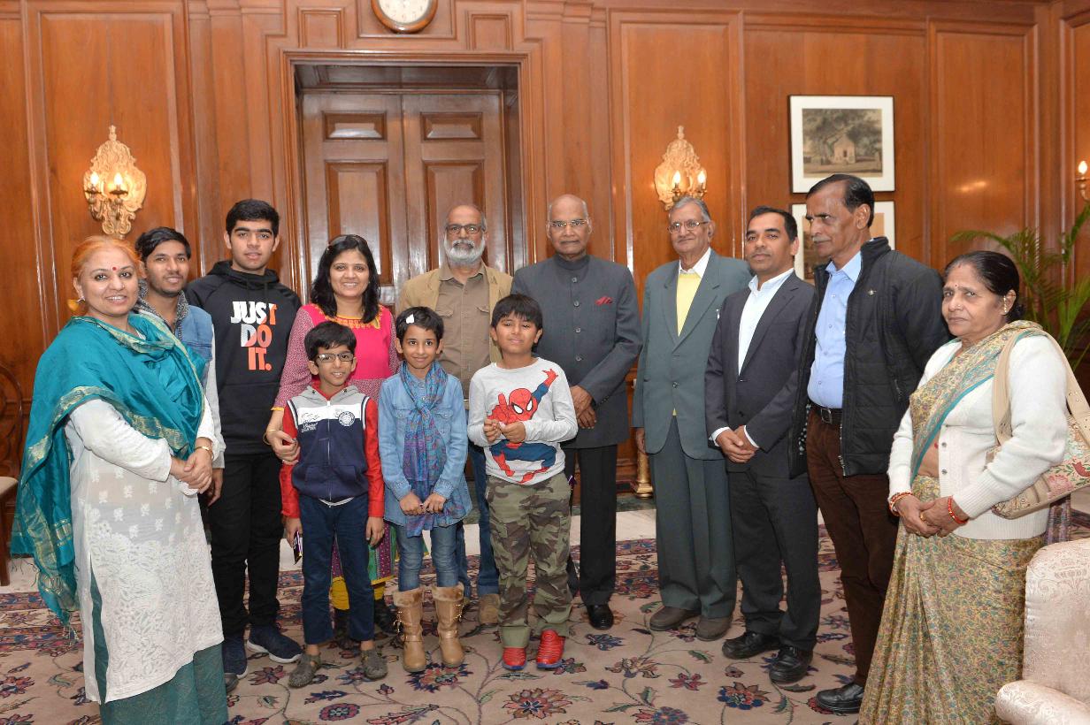 | Caption: | Shri Harkishore Verma & family from Jhinjhak, Kanpur Dehat meeting with the President of India, Shri Ram Nath Kovind, at Rashtrapati Bhavan on December 18, 2017. |