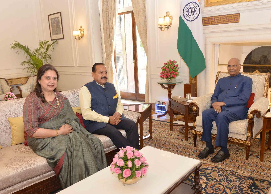| Caption: | The Minister of State (Independent Charge) for Development of North Eastern Region, Minister of State in the Prime Minister's Office, Personnel, Public Grievances & Pensions, Dr. Jitendra Singh along with his wife Smt. Manju Singh meeting with the President of India, Shri Ram Nath Kovind, at Rashtrapati Bhavan on June 10, 2019. |