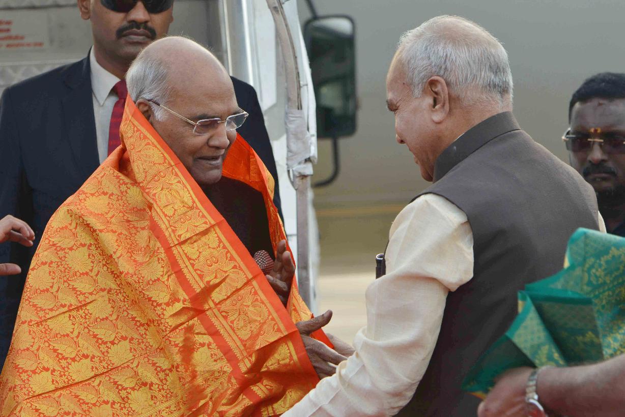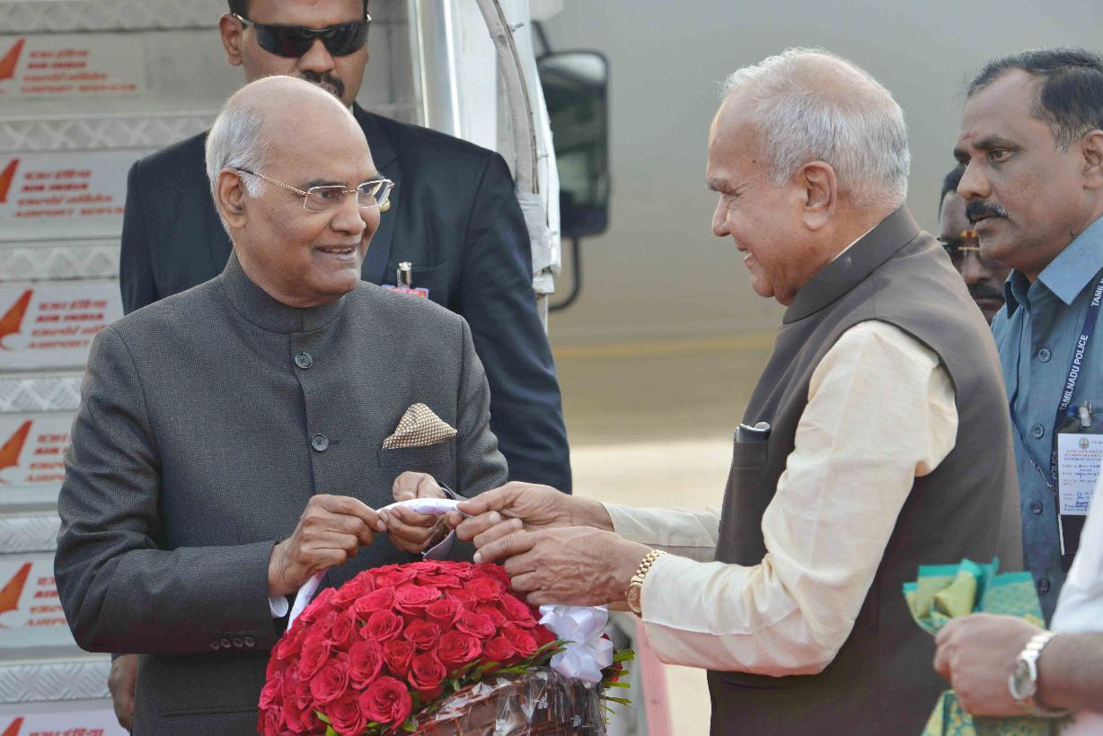 | Caption: | The President of India, Shri Ram Nath Kovind being received by the Governor of Tamil Nadu, Shri Banwarilal Purohit and the Chief Minister of Tamil Nadu, Shri O. Panneerselvam, at Chennai Airport, in Tamil Nadu on December 23, 2017. |