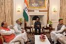 | Caption: | The Minister of Parliamentary Affairs, Shri Narendra Singh Tomar along with the Ministers of State for Parliamentary Affairs, Shri Vijay Goel and Shri Arjun Ram Meghwal meeting with the President of India, Shri Ram Nath Kovind, at Rashtrapati Bhavan on May 24, 2019. |
