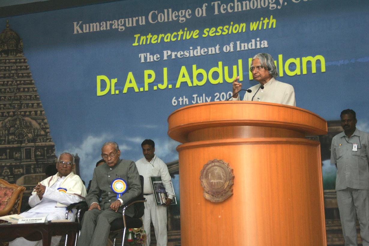 | Caption: | The President of India, Dr A P J Abdul Kalam visiting the Kumaraguru College of Technology and interacting with the Student of College at Coimbatore in Tamil Nadu on July 06, 2005 |
