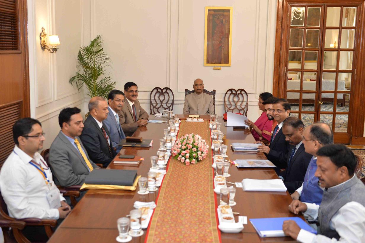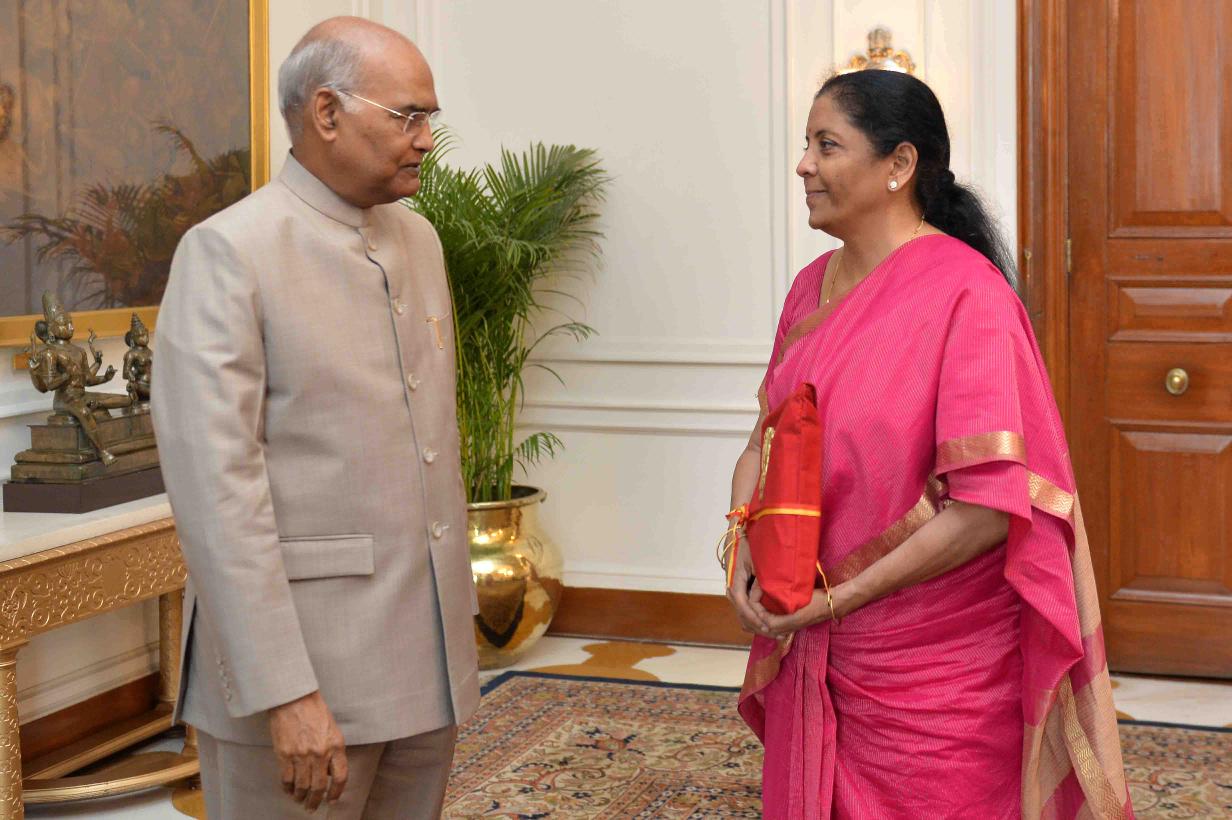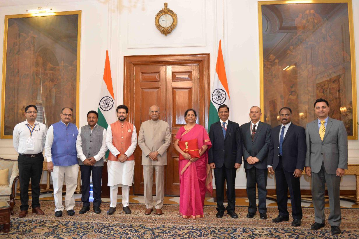 | Caption: | The Minister of Finance, Smt. Nirmala Sitharaman along with the Minister of State for Finance, Shri Anurag Singh Thakur and Senior Officers of Finance Ministry calling on the President of India, Shri Ram Nath Kovind, at Rashtrapati Bhavan before presenting the Union Budget on July 05, 2019. |