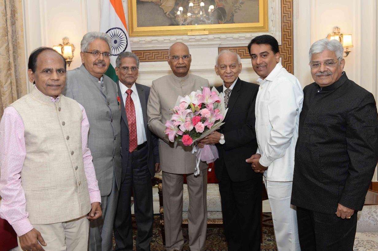 | Caption: | Shri K. Chakravarthi, Chancellor, Sri Sathya Sai Institute of Higher Learning with others meeting with the President of India, Shri Ram Nath Kovind, at Rashtrapati Bhavan on June 13, 2019. |