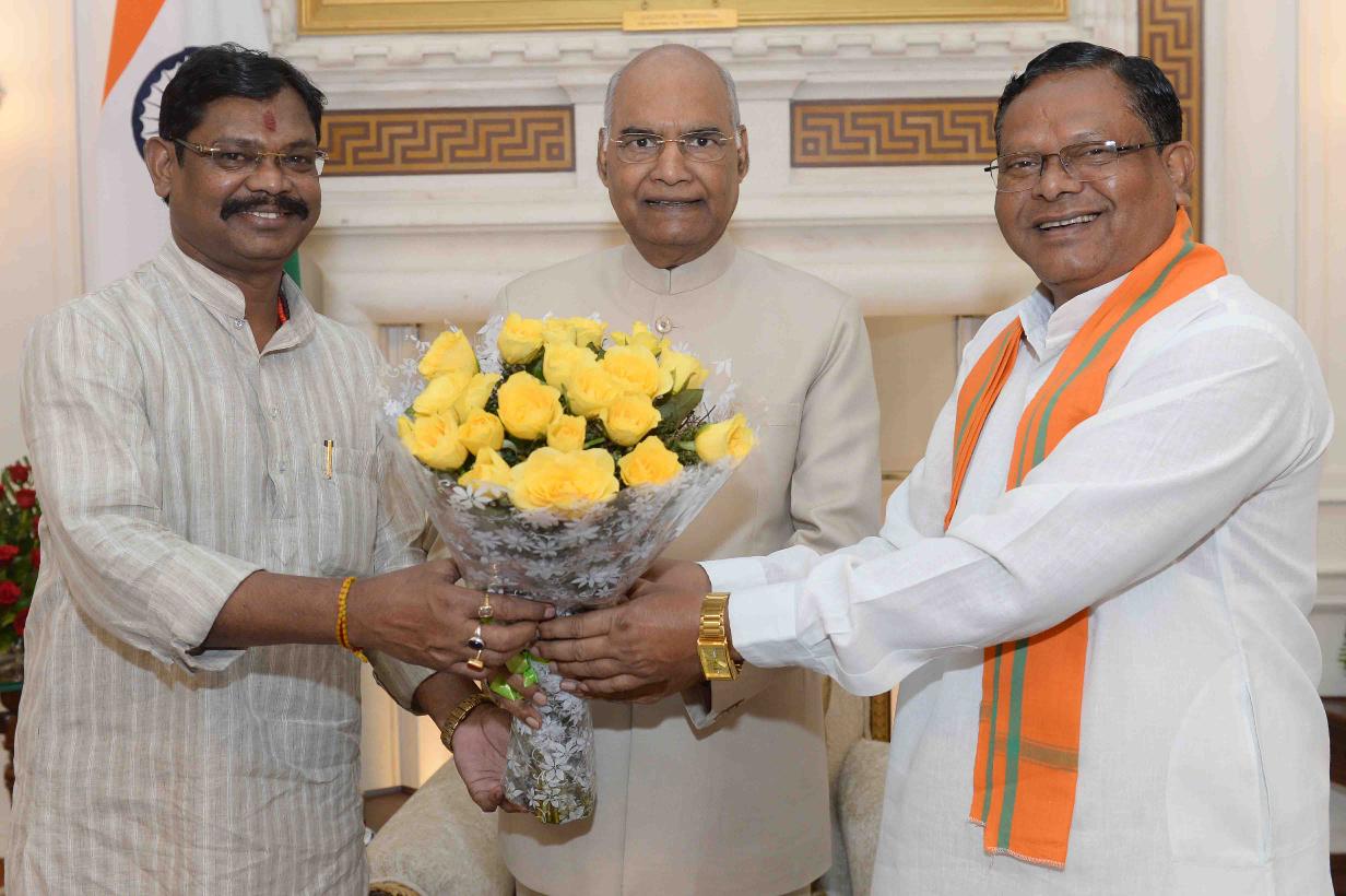 | Caption: | Shri Kamalbhan Singh Marabi, Ex. MP (Lok Sabha) along with Shri Ram Sewak Paikra, former Home Minister of Chhattisgarh meeting with the President of India, Shri Ram Nath Kovind, at Rashtrapati Bhavan on July 18, 2019. |