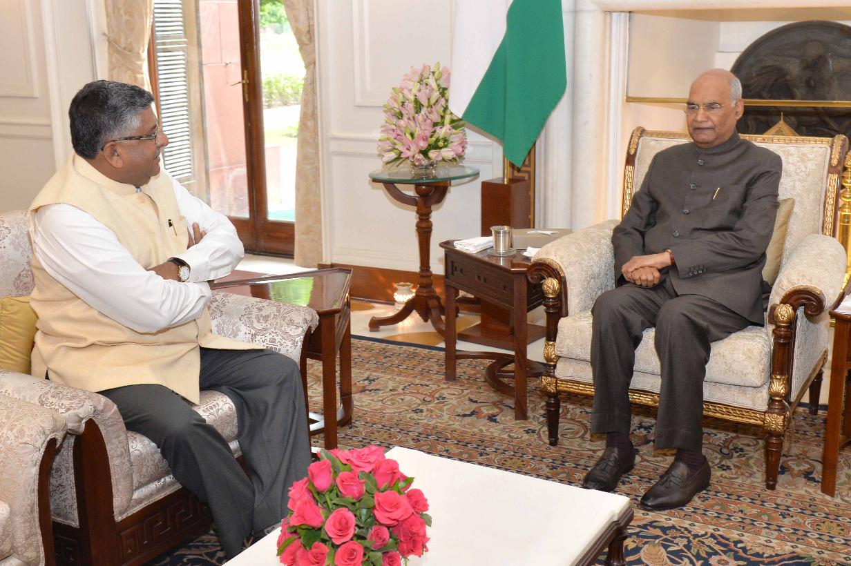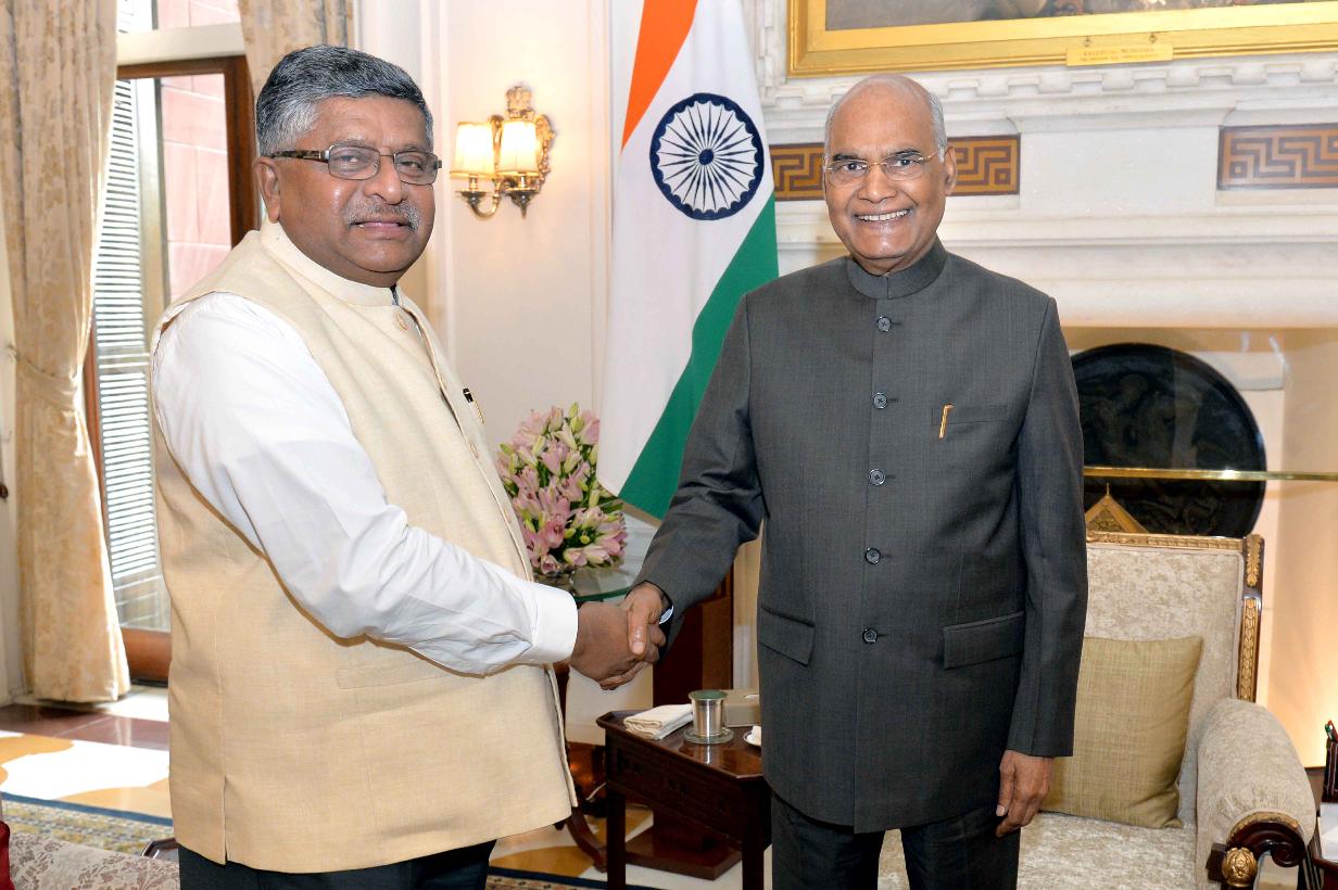 | Caption: | The Minister of Law & Justice, Communications, Electronics and Information Technology, Shri Ravi Shankar Prasad meeting with the President of India, Shri Ram Nath Kovind, at Rashtrapati Bhavan on July 09, 2019. |