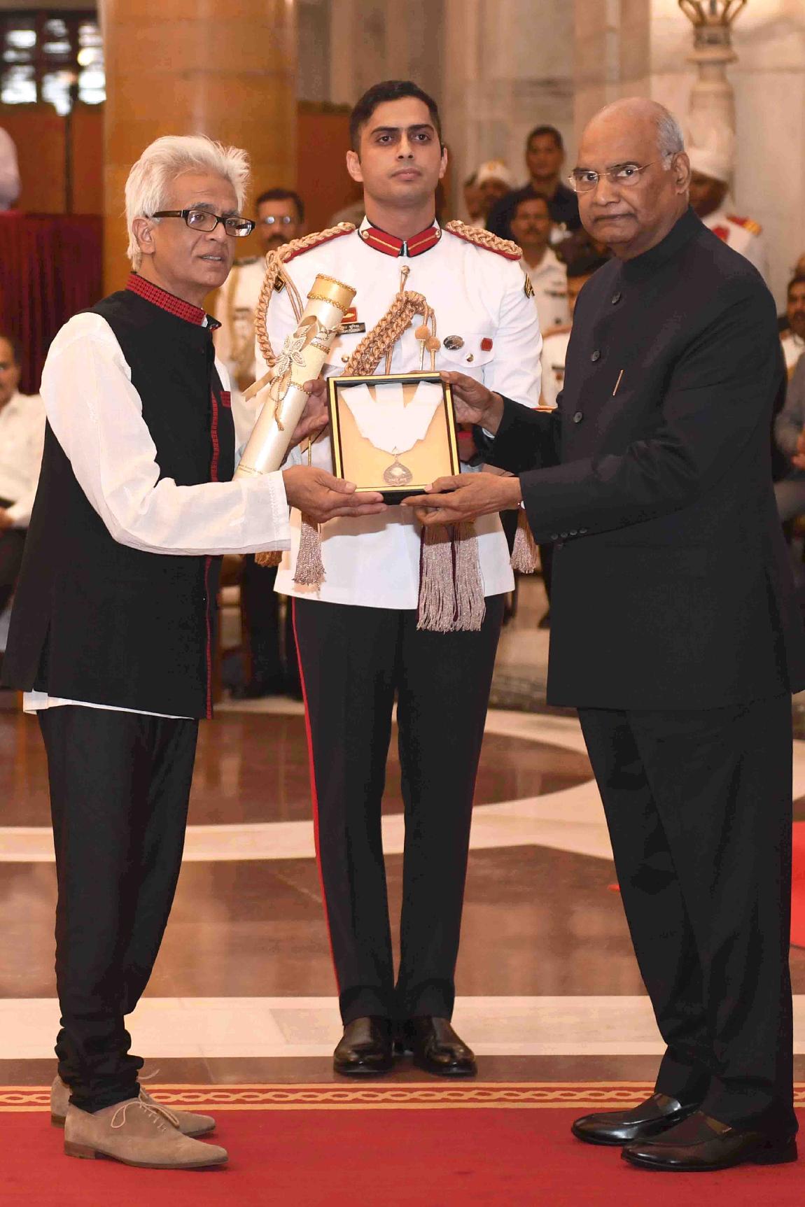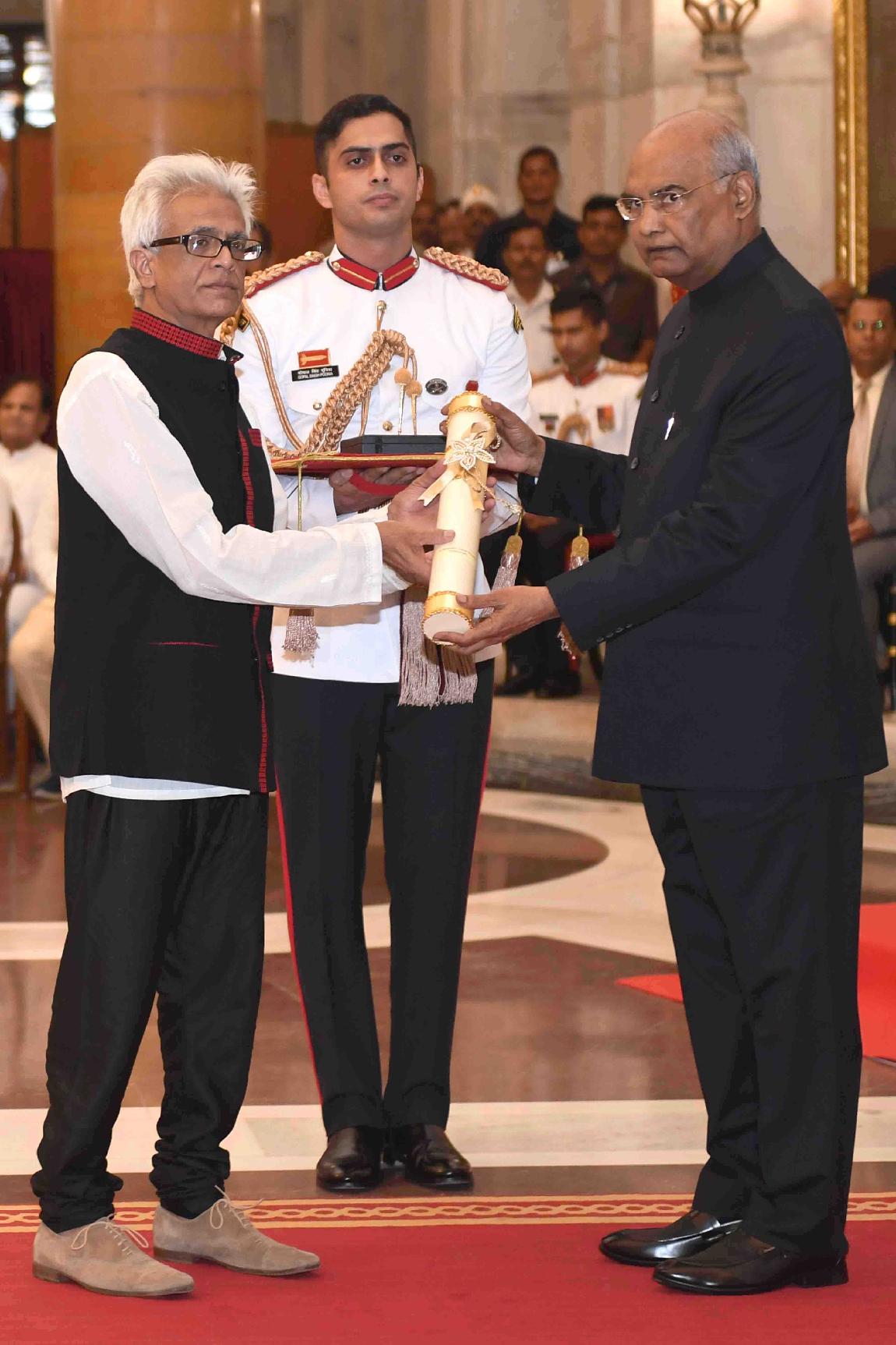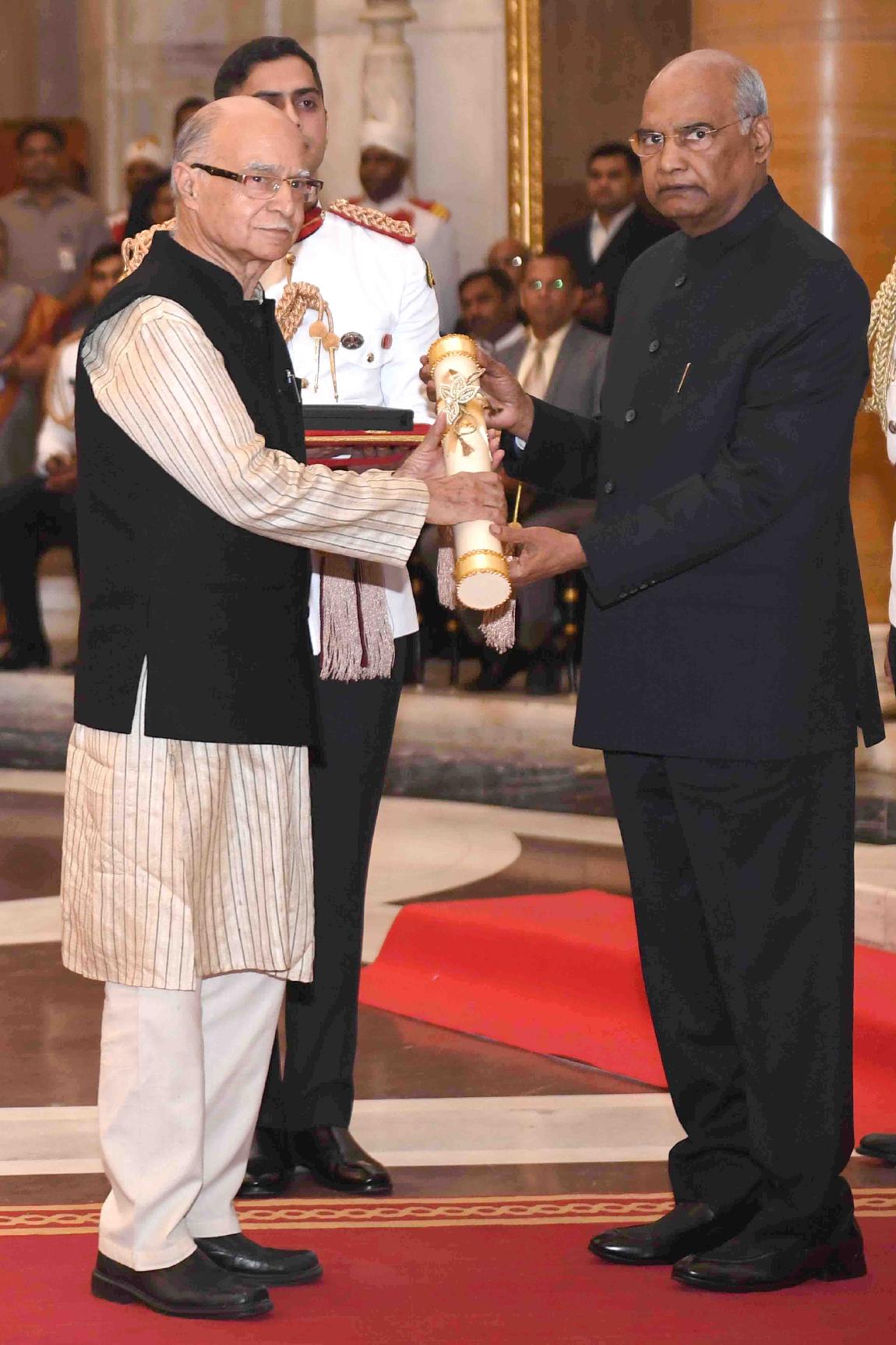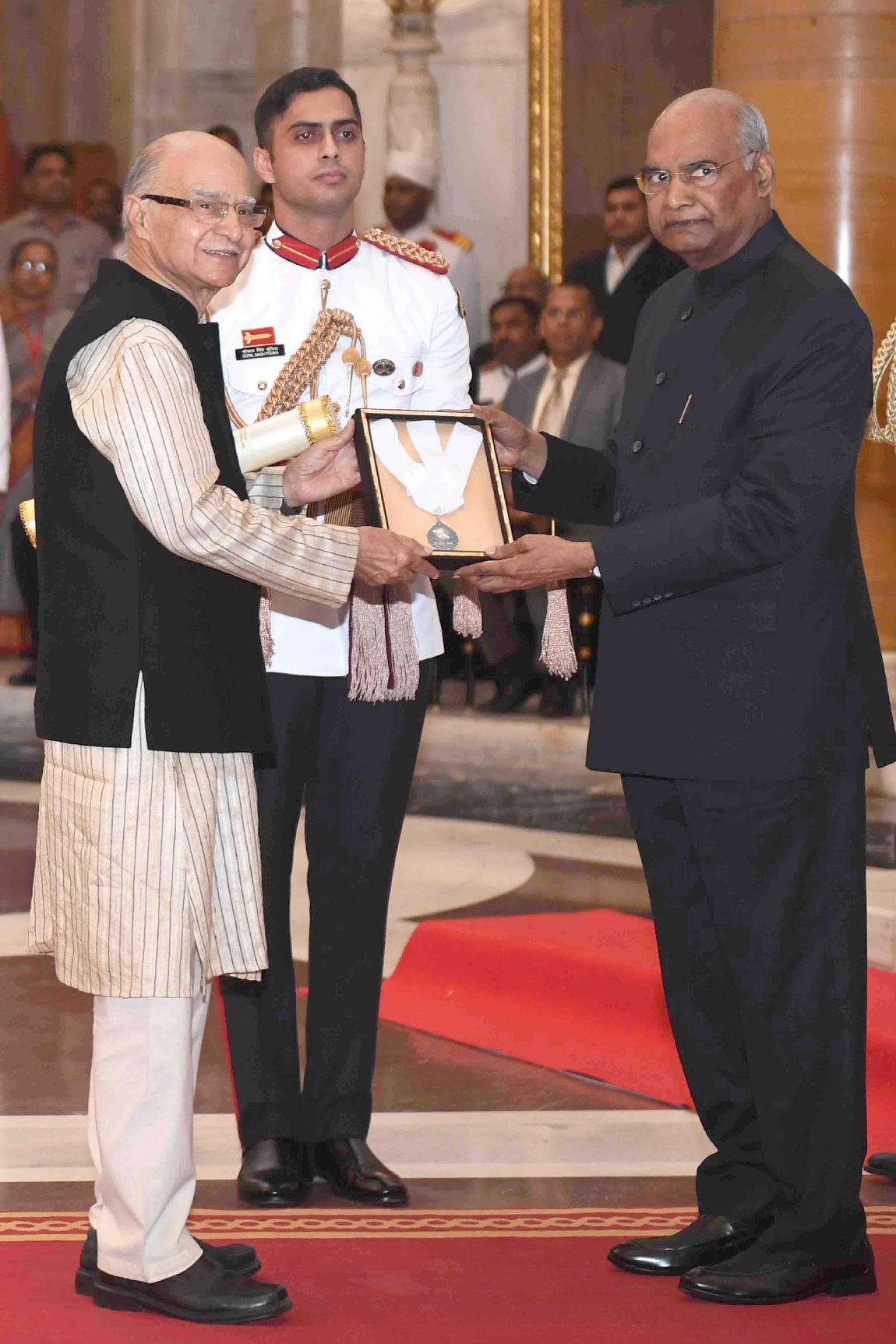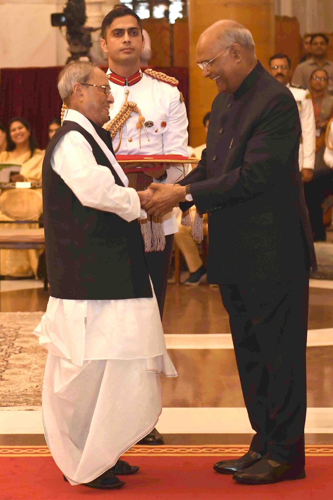 | Caption: | The President of India, Shri Ram Nath Kovind presenting Bharat Ratna Awards to Shri Nanaji Deshmukh (posthumously), Dr Bhupendra Kumar Hazarika (posthumously) and Shri Pranab Mukherjee, former President of India, at an Investiture Ceremony, at Rashtrapati Bhavan on August 08, 2019. |