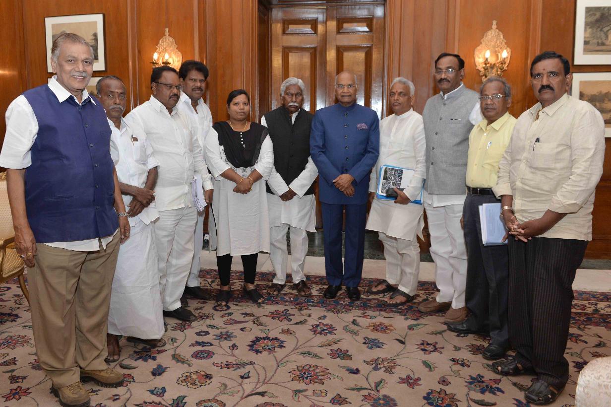 | Caption: | The Minister for Health & Family Welfare, Tourism & Civil Aviation, Fisheries, Housing, Sports & Youth Affairs, Art & Culture Irrigation and Flood Control, Govt. of Puducherry, Shri Malladi Krishna Rao alongwith a delegation from Andhra Pradesh Backward Federation meeting with the President of India, Shri Ram Nath Kovind, at Rashtrapati Bhavan on February 15, 2018. |