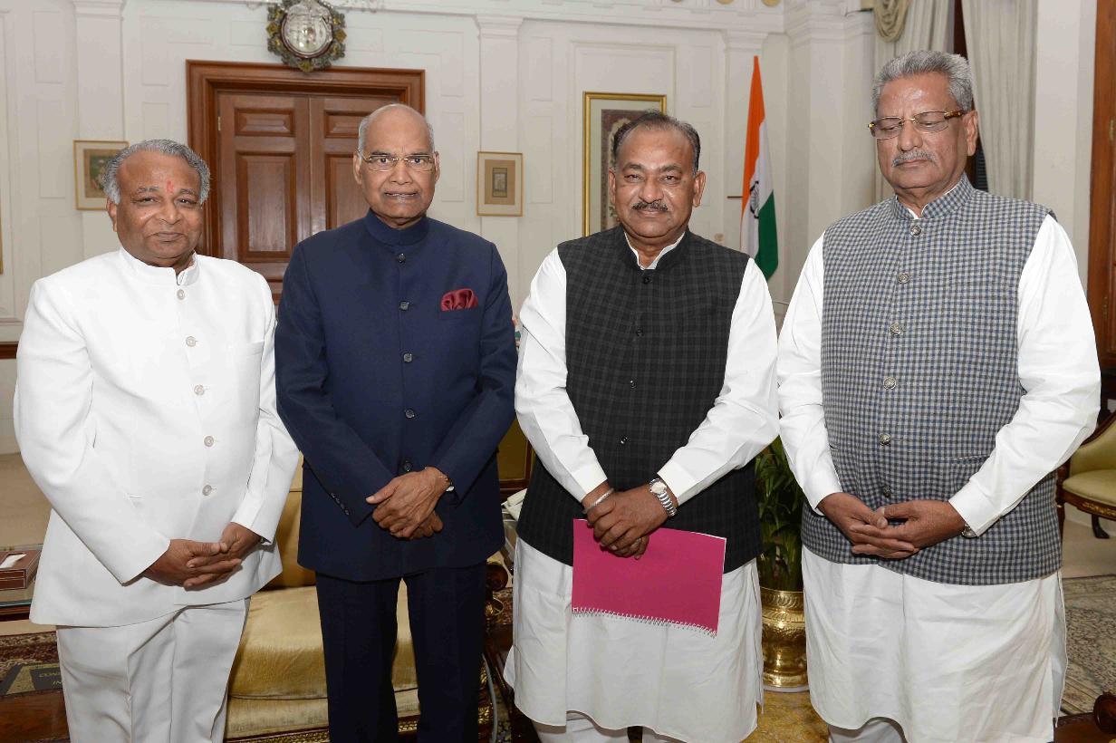| Caption: | Shri Om Prakash Mathur, MP (RS) & Chairman, House Committee, Rajya Sabha along with Shri Pushp Jain, Ex-MP (RS) and Shri Nemichand Chopra from Pali, Rajasthan meeting with the President of India, Shri Ram Nath Kovind, at Rashtrapati Bhavan on February 09, 2018. |