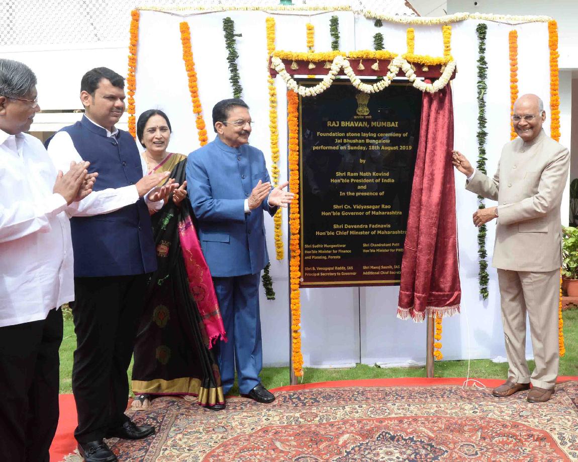| Caption: | The President of India, Shri Ram Nath Kovind unveiling the plaque for reconstruction of Jal Bhushan, at Raj Bhavan, in Mumbai on August 18, 2019. |