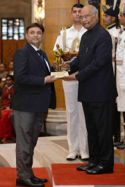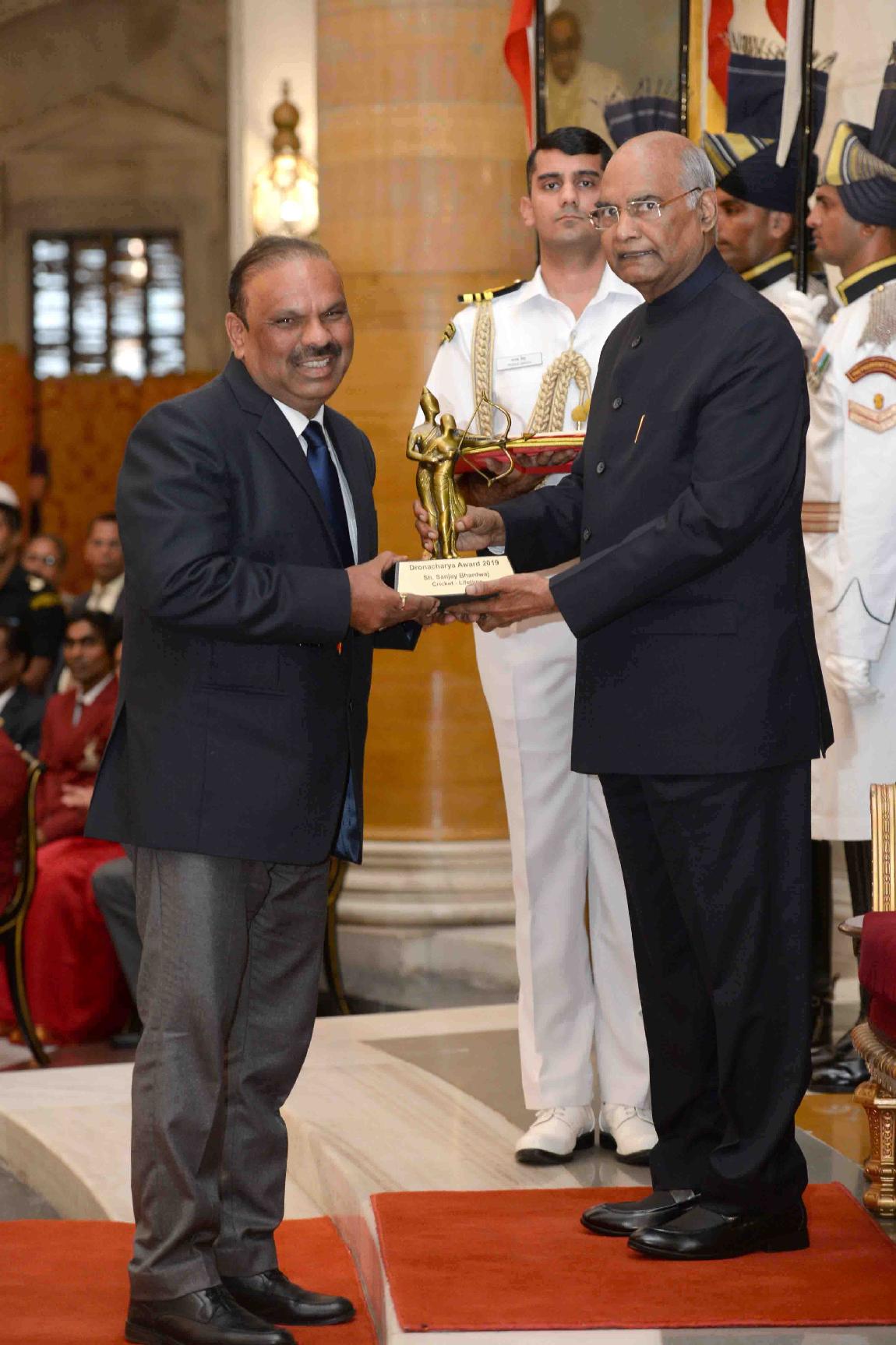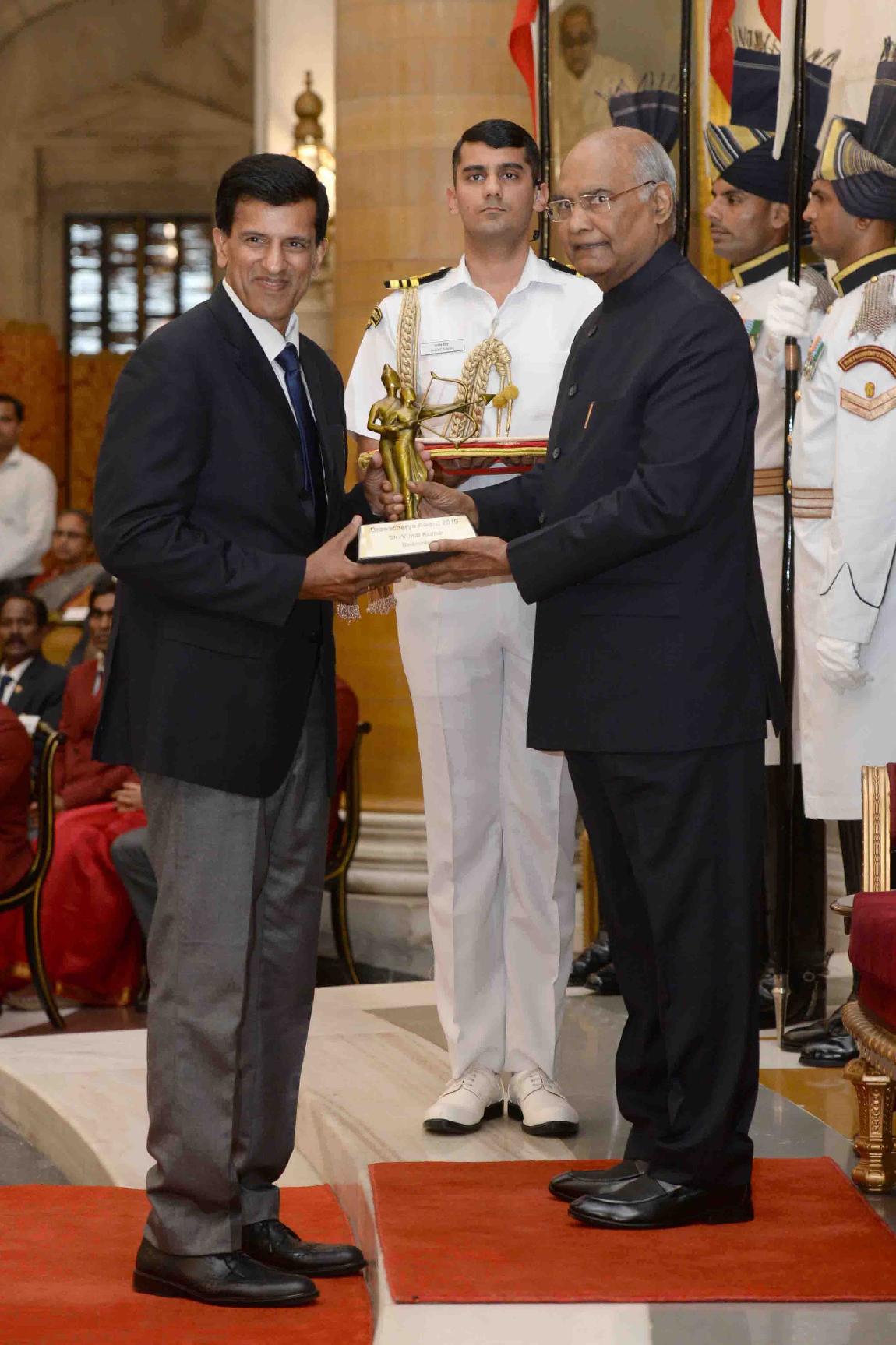 | Caption: | The President of India, Shri Ram Nath Kovind presenting the Dronacharya Awards 2019 to Shri Vimal Kumar, Shri Sandeep Gupta, Shri Merzban Patel, Shri Rambir Singh Khokhar and Shri Sanjay Bhardwaj, at the National Sports & Adventure Awards function, at Rashtrapati Bhavan on August 29, 2019. |