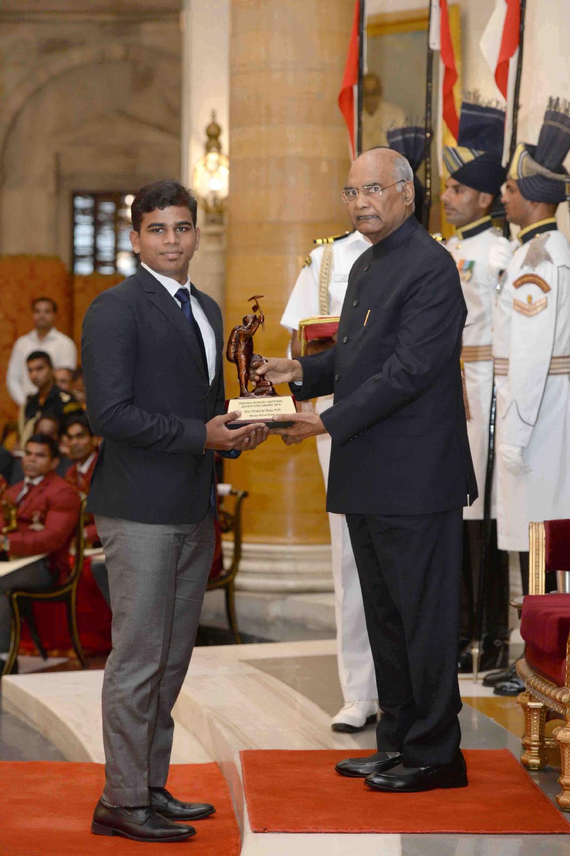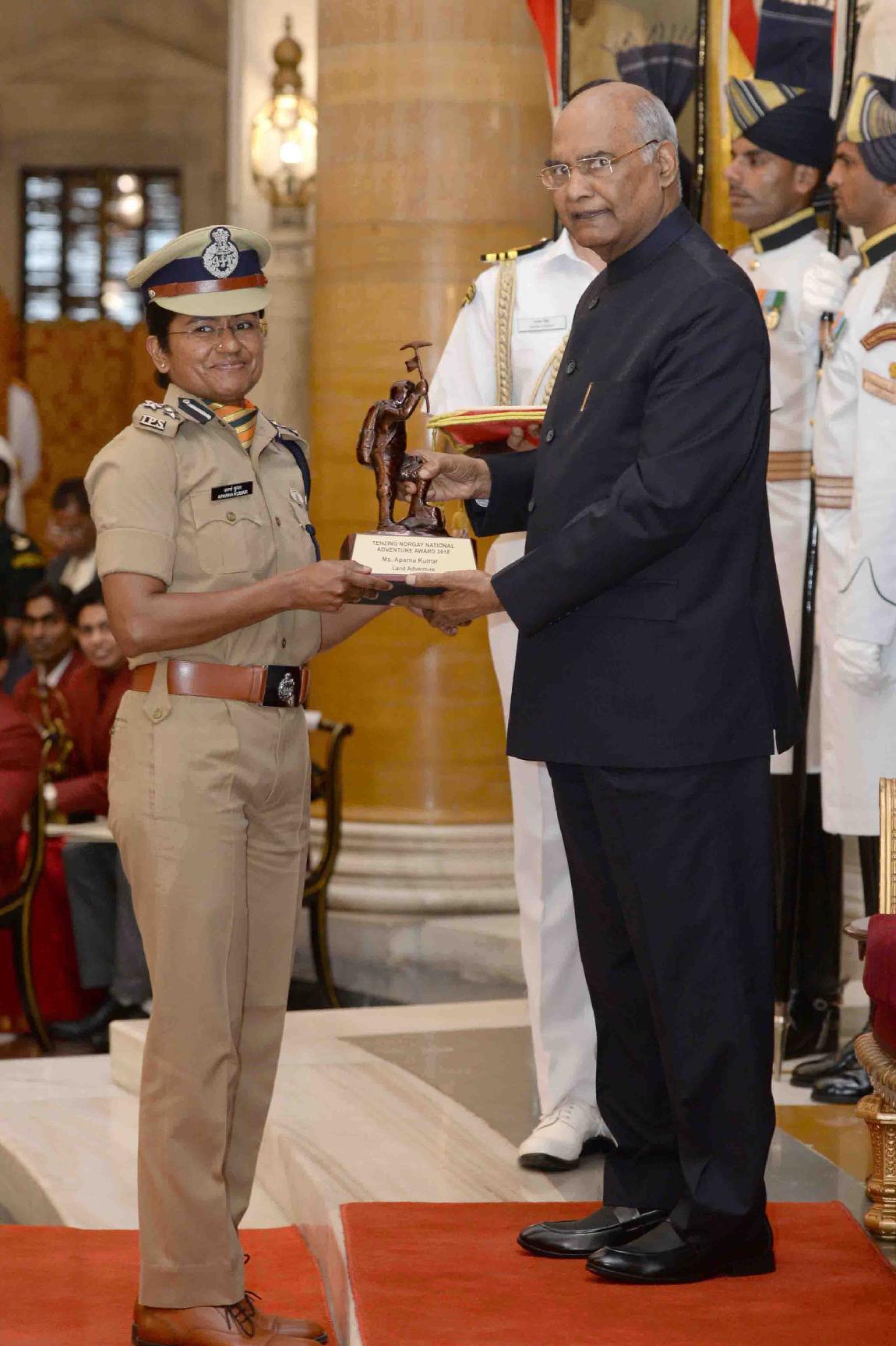 | Caption: | The President of India, Shri Ram Nath Kovind presenting the Tenzing Norgay National Adventure Awards 2018 to Ms. Aparna Kumar, late Shri Dipankar Ghosh, Shri Manikandan K., Shri Prabhat Raju Koli, Shri Rameshwer Jangra and Subedar Major Wangchuk Sherpa, at the National Sports & Adventure Awards function, at Rashtrapati Bhavan on August 29, 2019. |