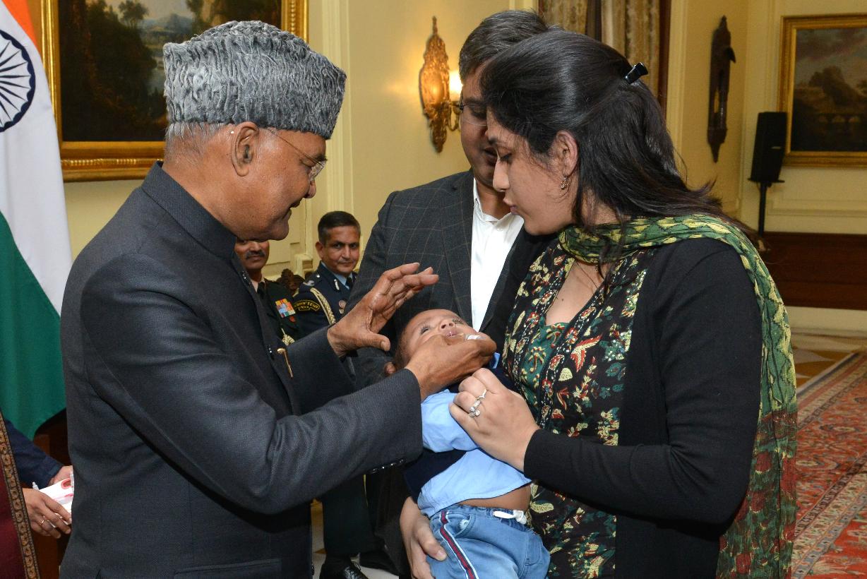 | Caption: | The President of India, Shri Ram Nath Kovind launches the Pulse Polio Programme by administering Polio drops to children, at Rashtrapati Bhavan on January 18, 2020. |